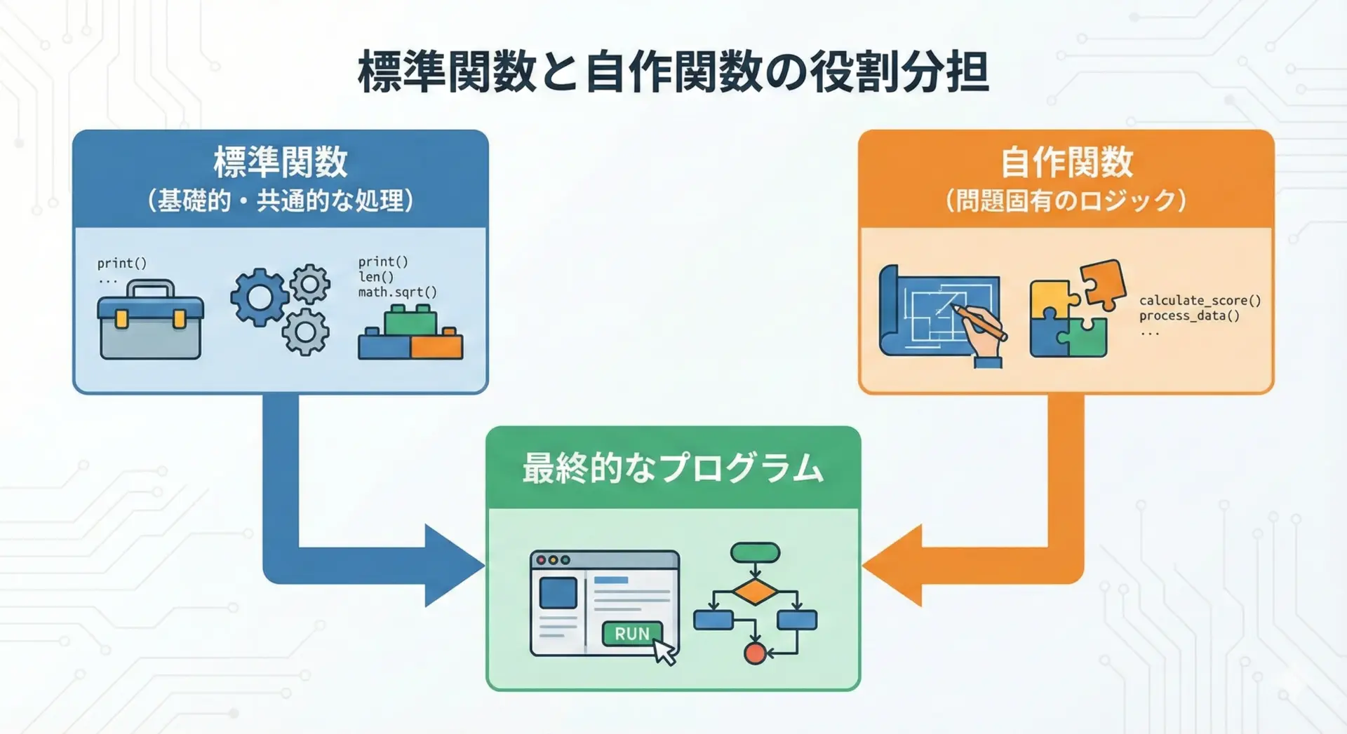 一方で、自分のプログラム特有のロジック、たとえば「テストの点数から成績を判定する」「ゲームのルールに従った状態遷移を行う」といった部分は、自作関数で実装する必要があります。
