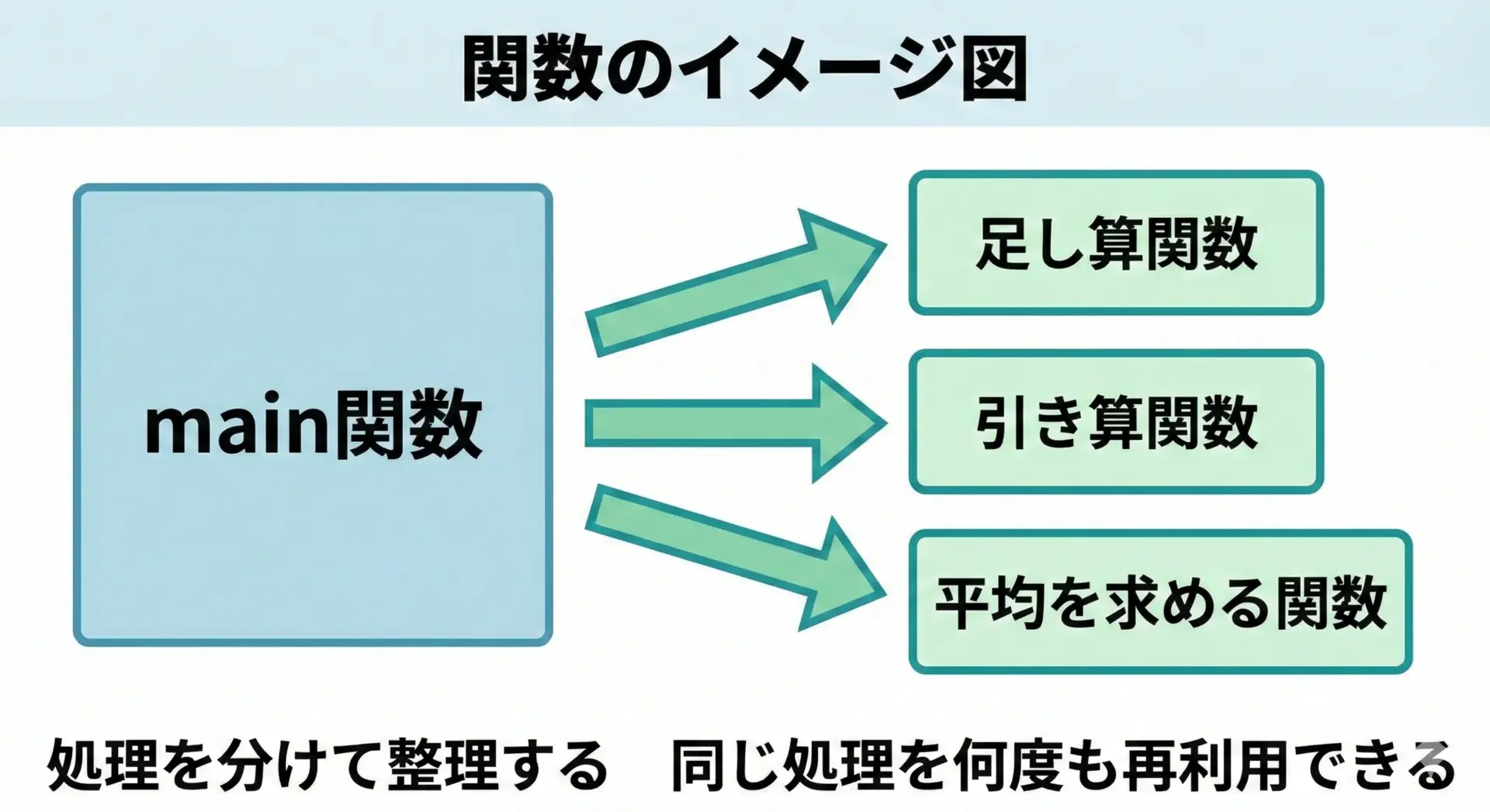 例えば「2つの整数を足す処理」や「配列の平均値を求める処理」などを関数にしておくことで、必要なときに名前を呼ぶだけでその処理を実行できます。