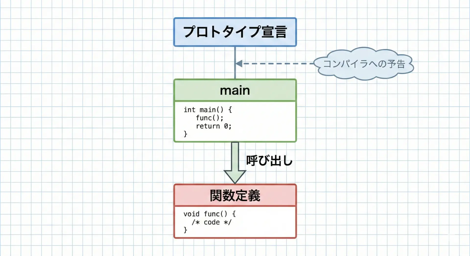 C言語の関数は、宣言(prototype宣言)と定義の2つの段階で記述するのが一般的です。