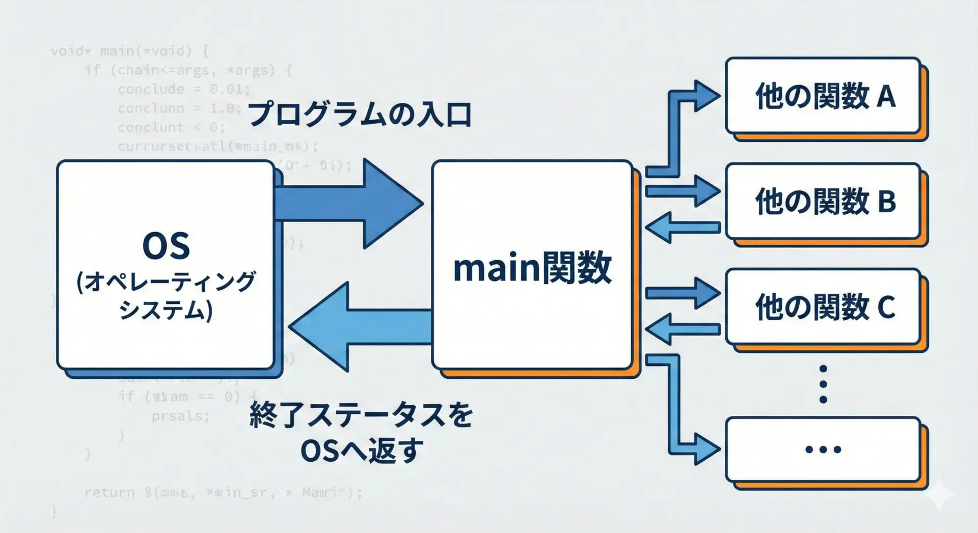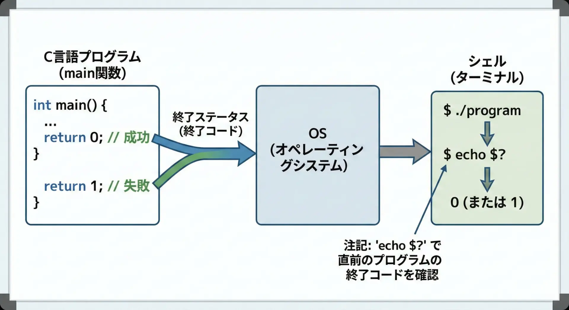 main関数の戻り値は、プログラムの終了ステータスとしてOSに返されます。
