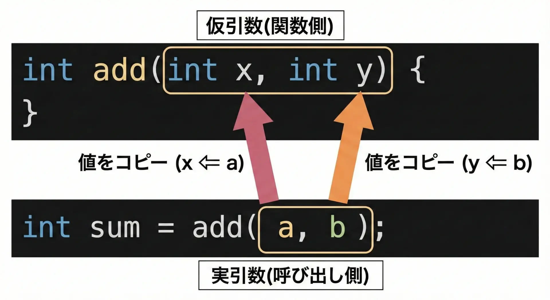 ポイントは、呼び出し時に「実引数の値」が「仮引数の変数」にコピーされるということです。