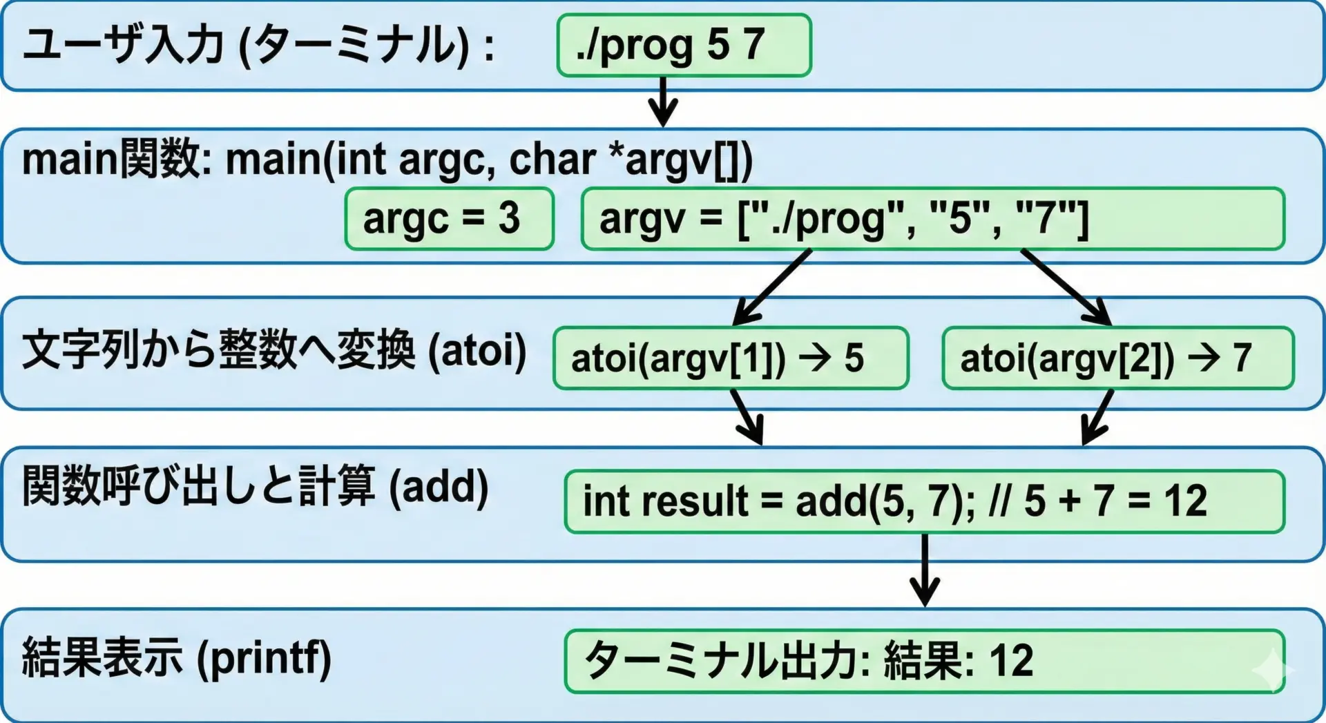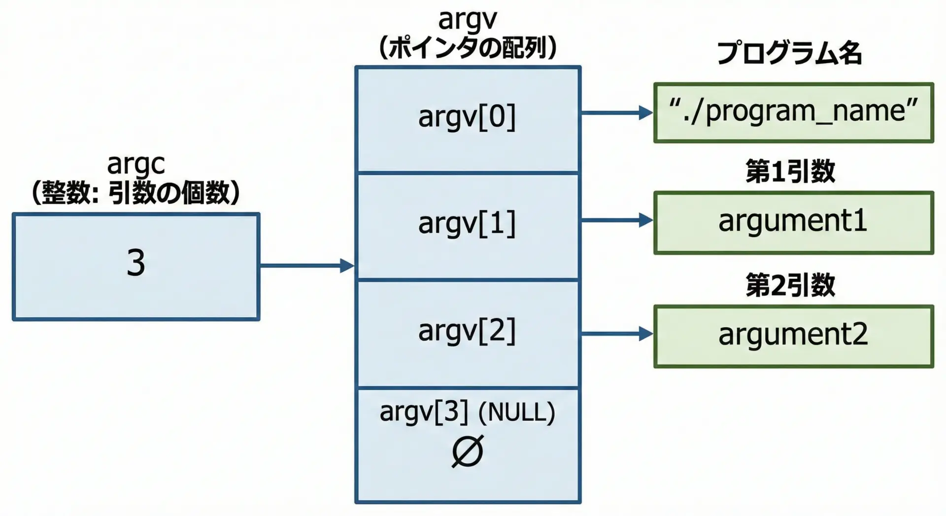 このように、argcで引数の個数をチェックし、argvで内容を受け取り、必要に応じて型変換を行うのが基本の流れです。