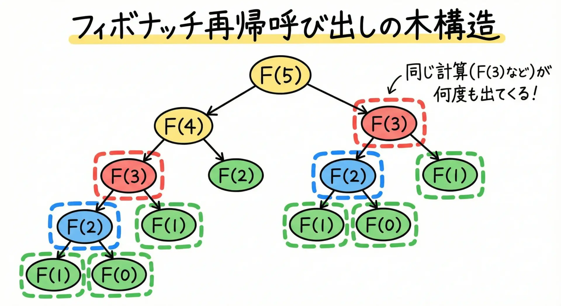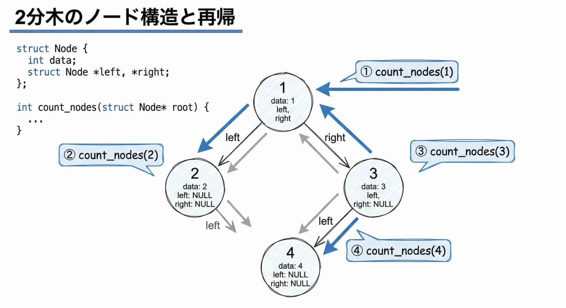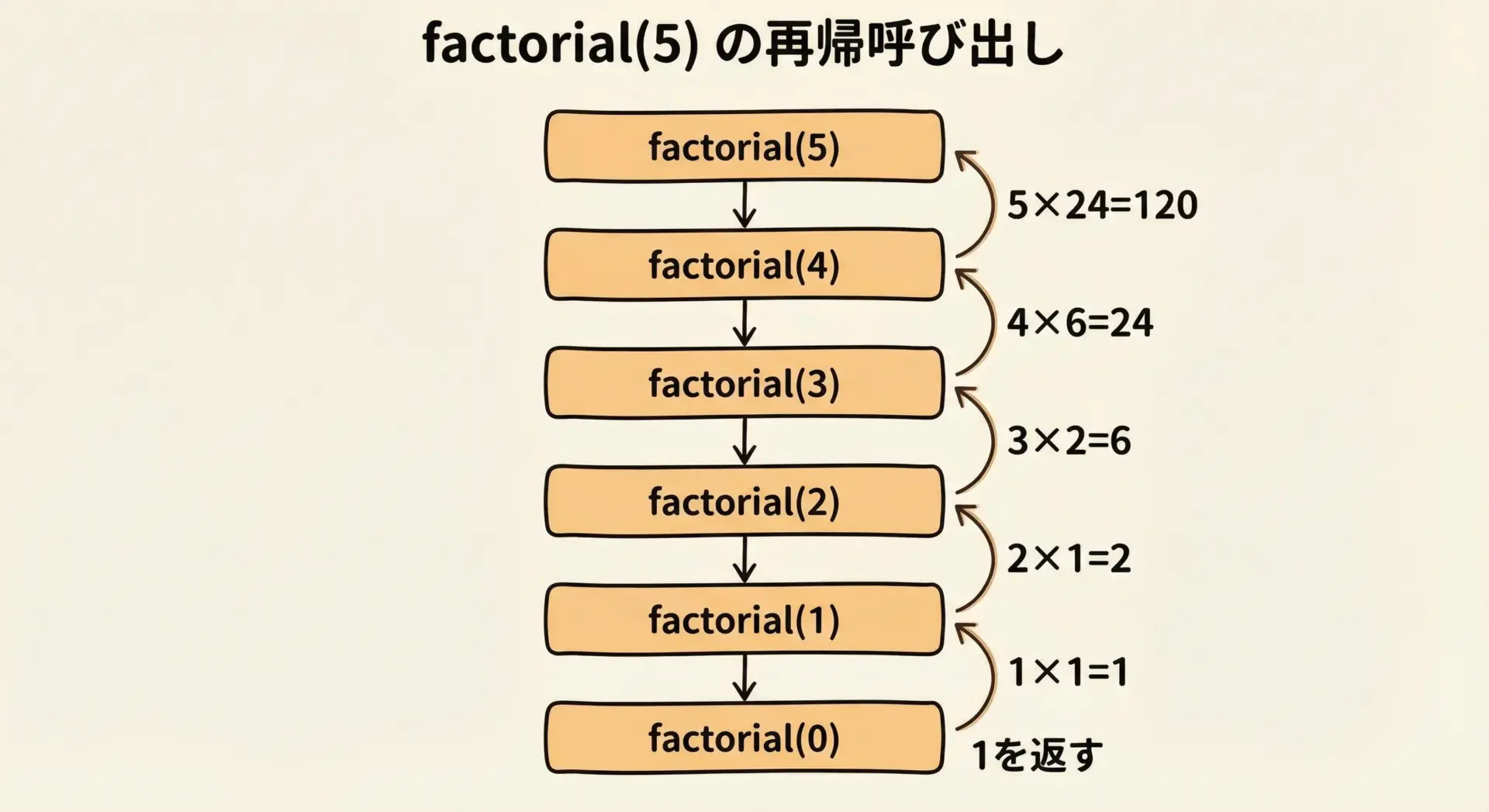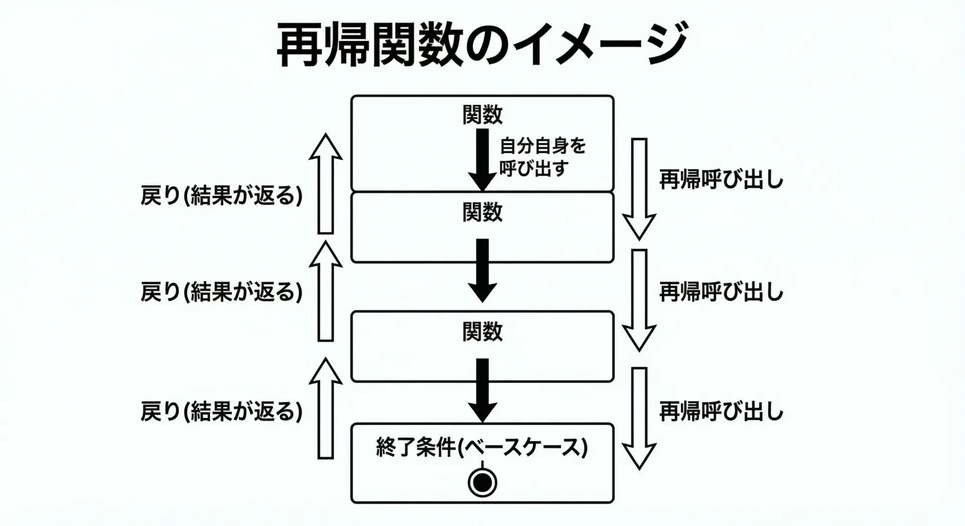 この図のように、再帰関数は同じ処理を、問題を少しずつ小さくしながら何度も呼び出し、最後にベースケースに到達したところで戻りながら結果を組み立てていきます。