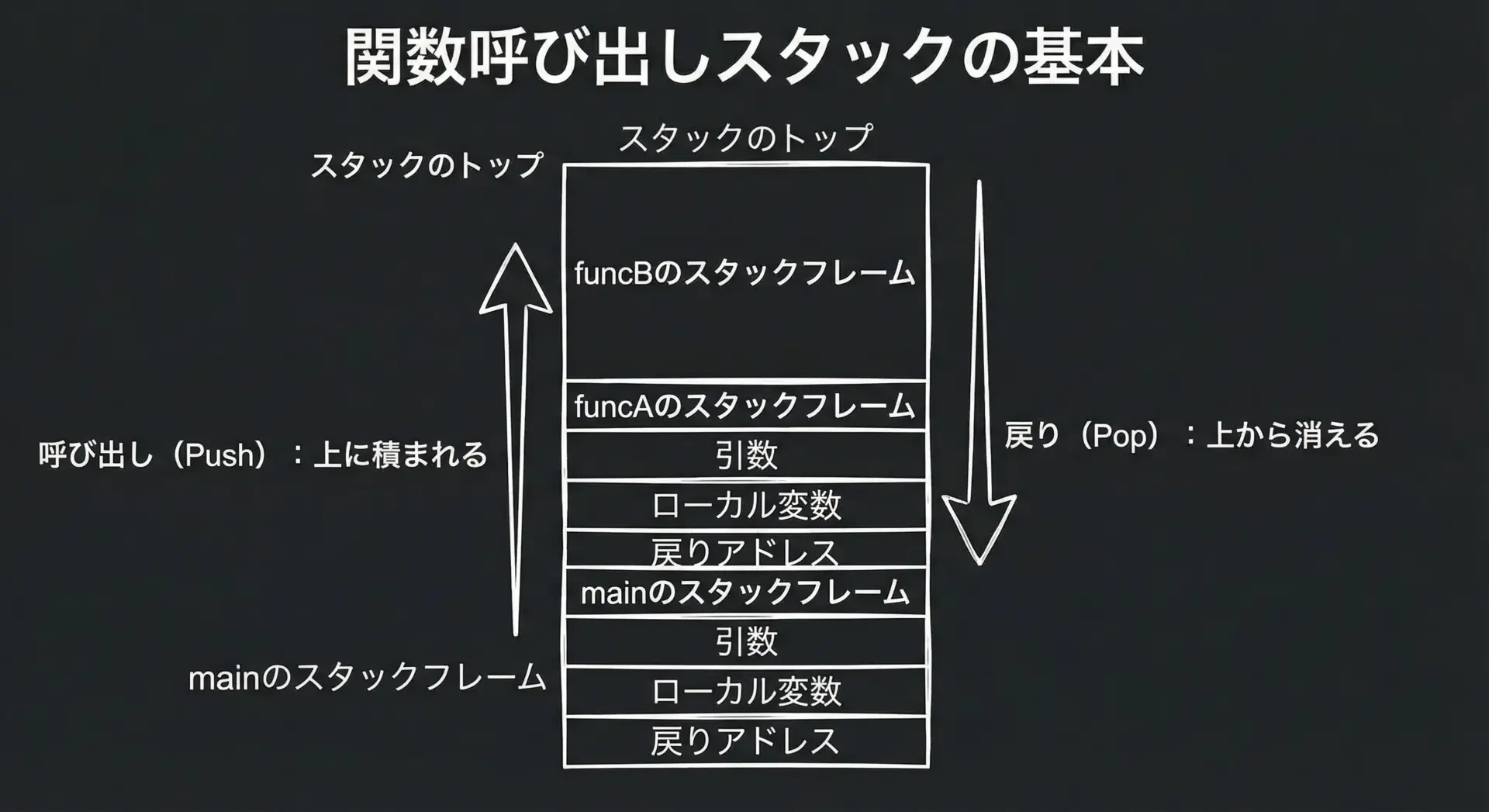 関数が呼ばれるたびに、スタックフレームと呼ばれるメモリ領域が積み上がります。