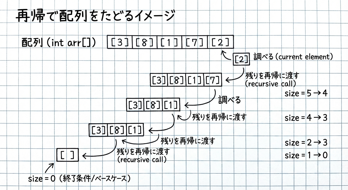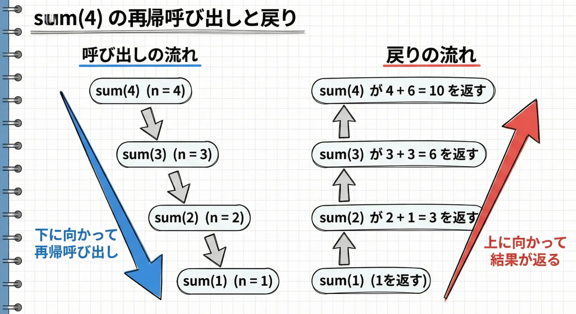 再帰では、関数が呼ばれるたびにスタックが1段増え、ベースケースに到達したあとに、逆順に値が戻っていくという流れになります。