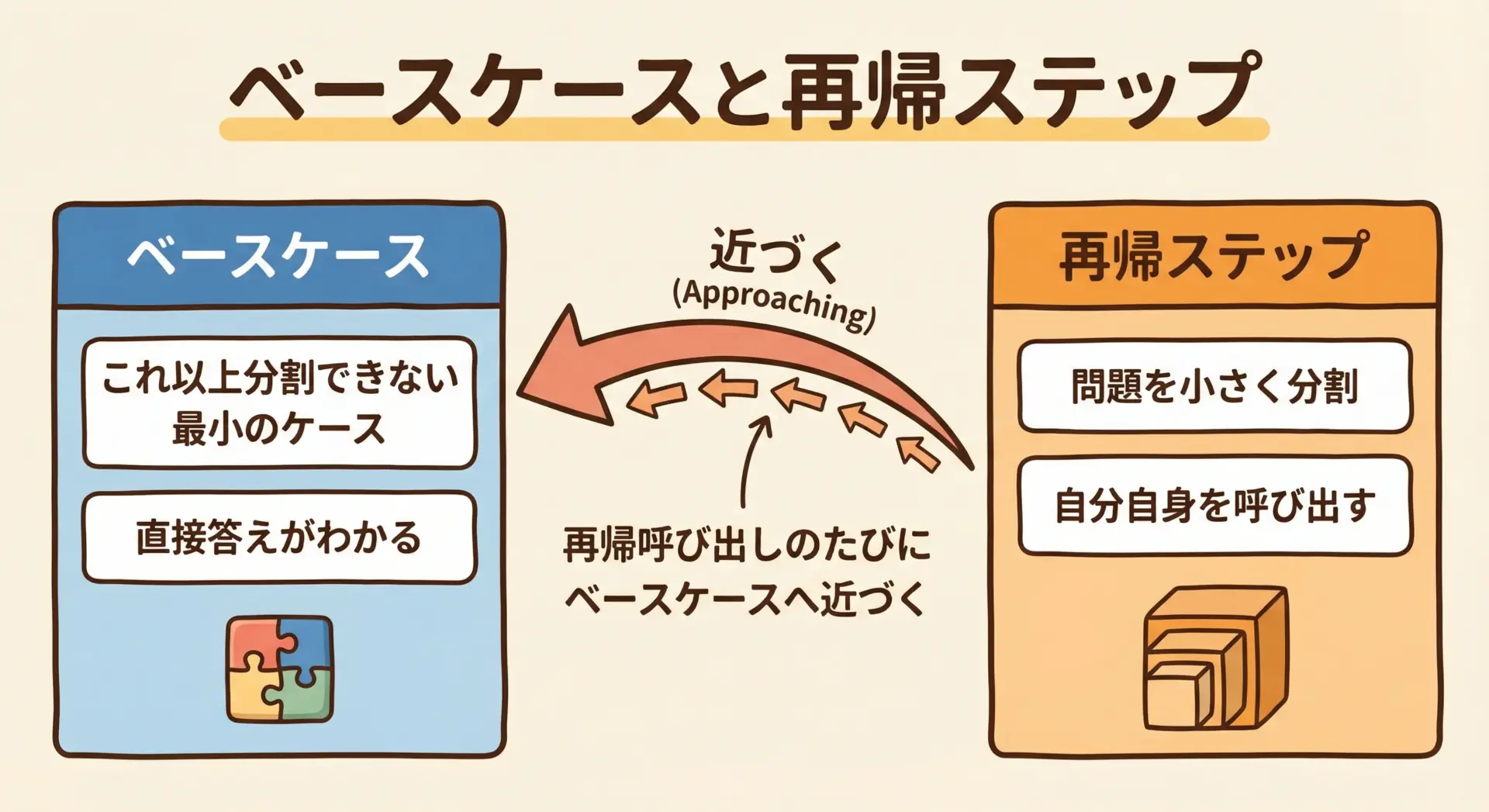 再帰関数を安全に書くうえで、ベースケース再帰ステップをきちんと分けて考えることが重要です。