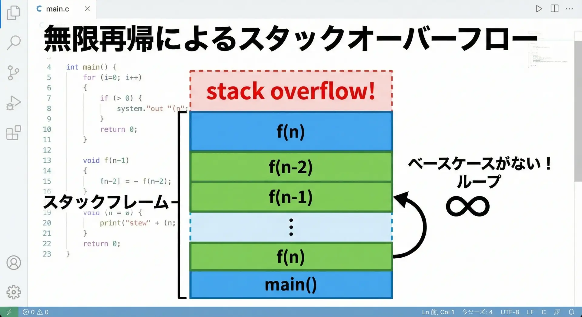 一方で、C言語で再帰を使うときには次のようなデメリットや注意点があります。