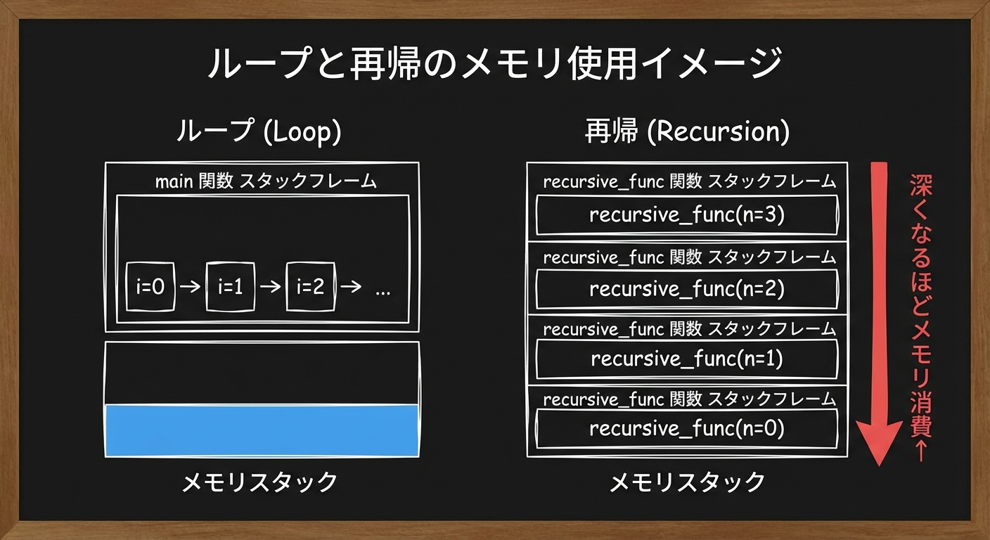 再帰を使うと、呼び出しの深さ分だけスタックフレームが積み上がるため、メモリ使用量が増えます。
