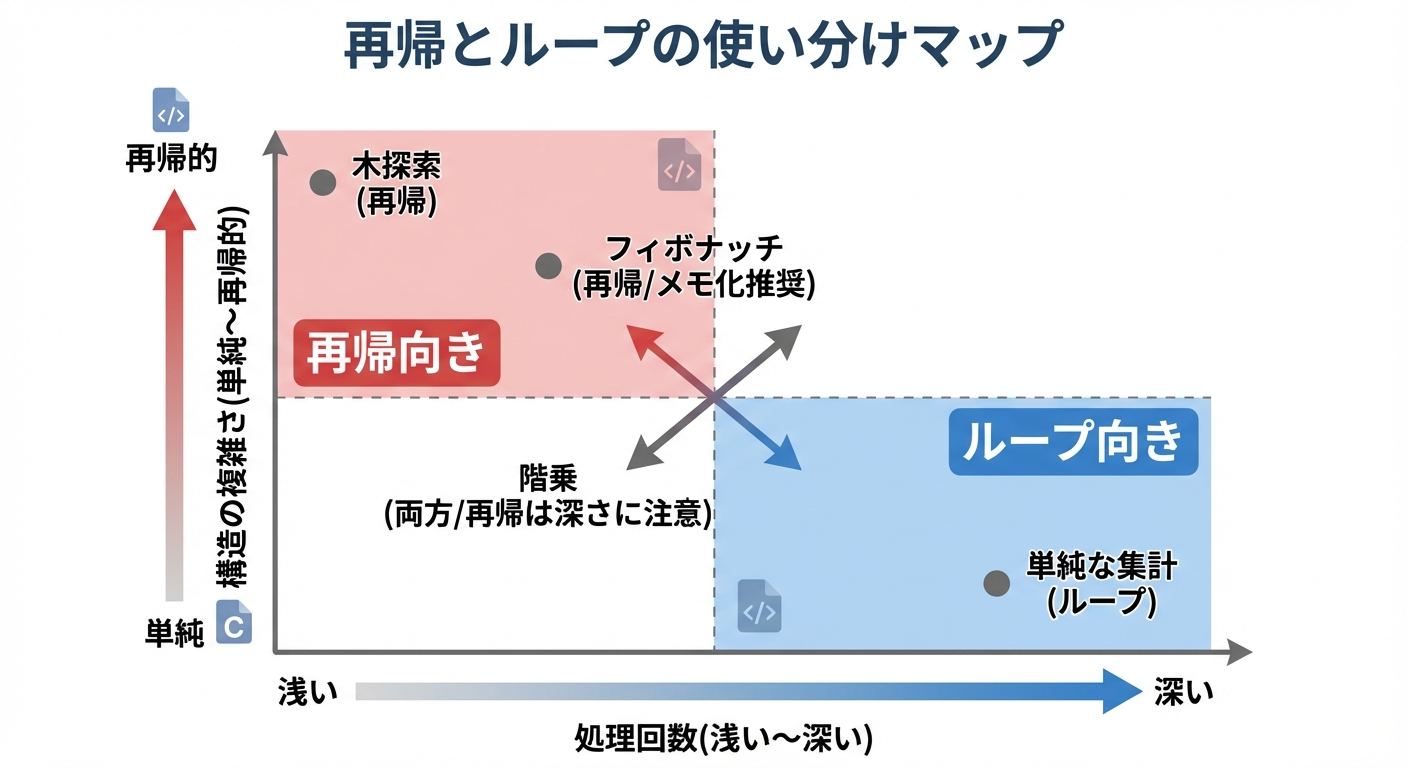 「読みやすさ」と「効率・安全性」のバランスを考えながら、再帰とループを選択するのが実践的です。