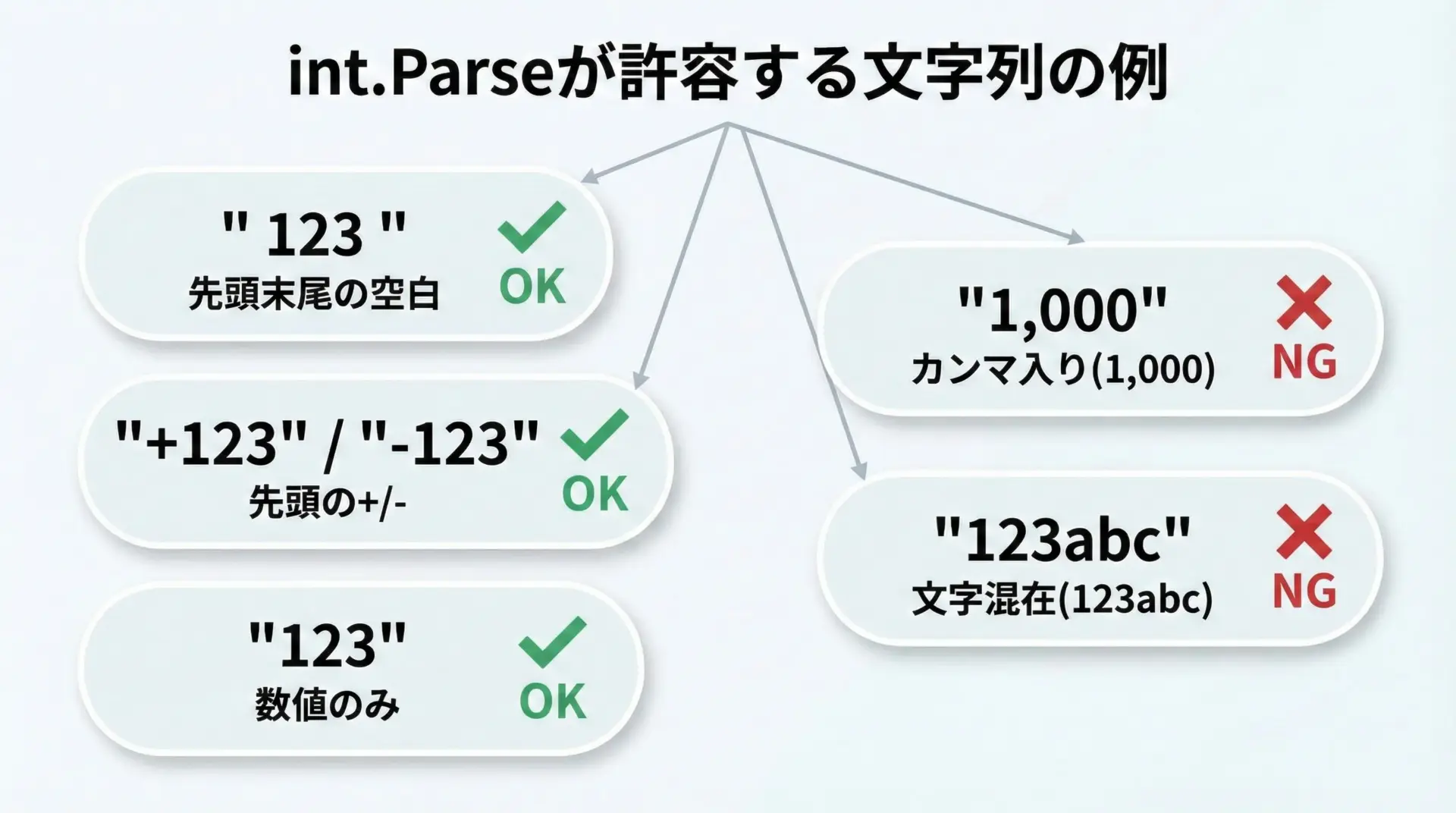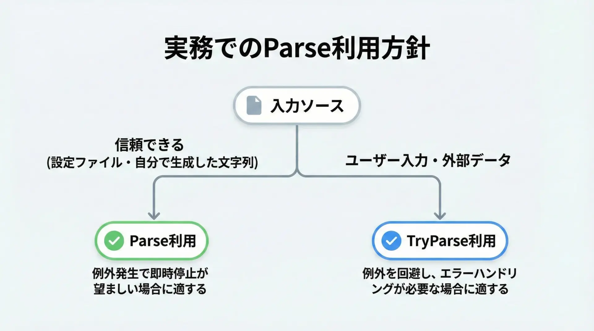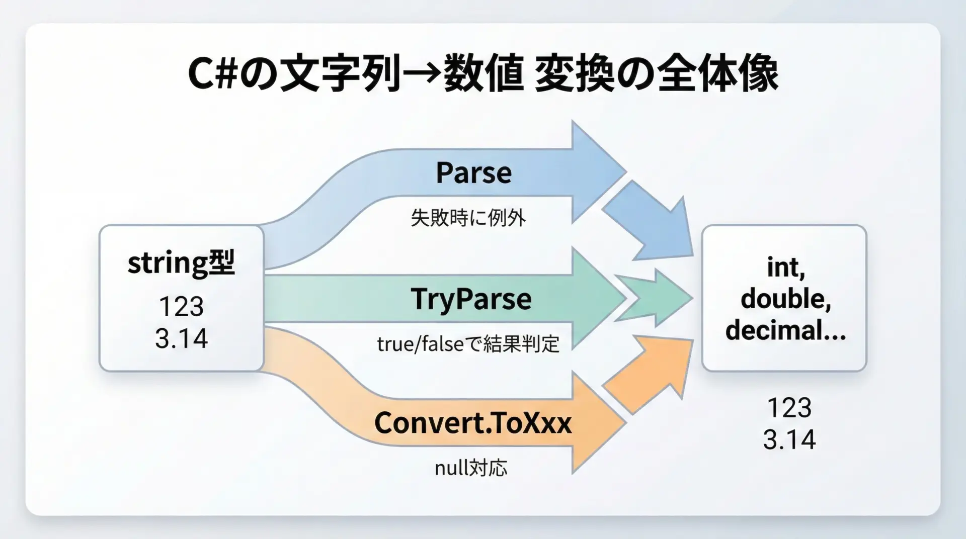変換の前提条件や入力元の信頼性に応じて、Parse、TryParse、Convertを使い分けることで、堅牢で分かりやすいコードを書くことができます。
