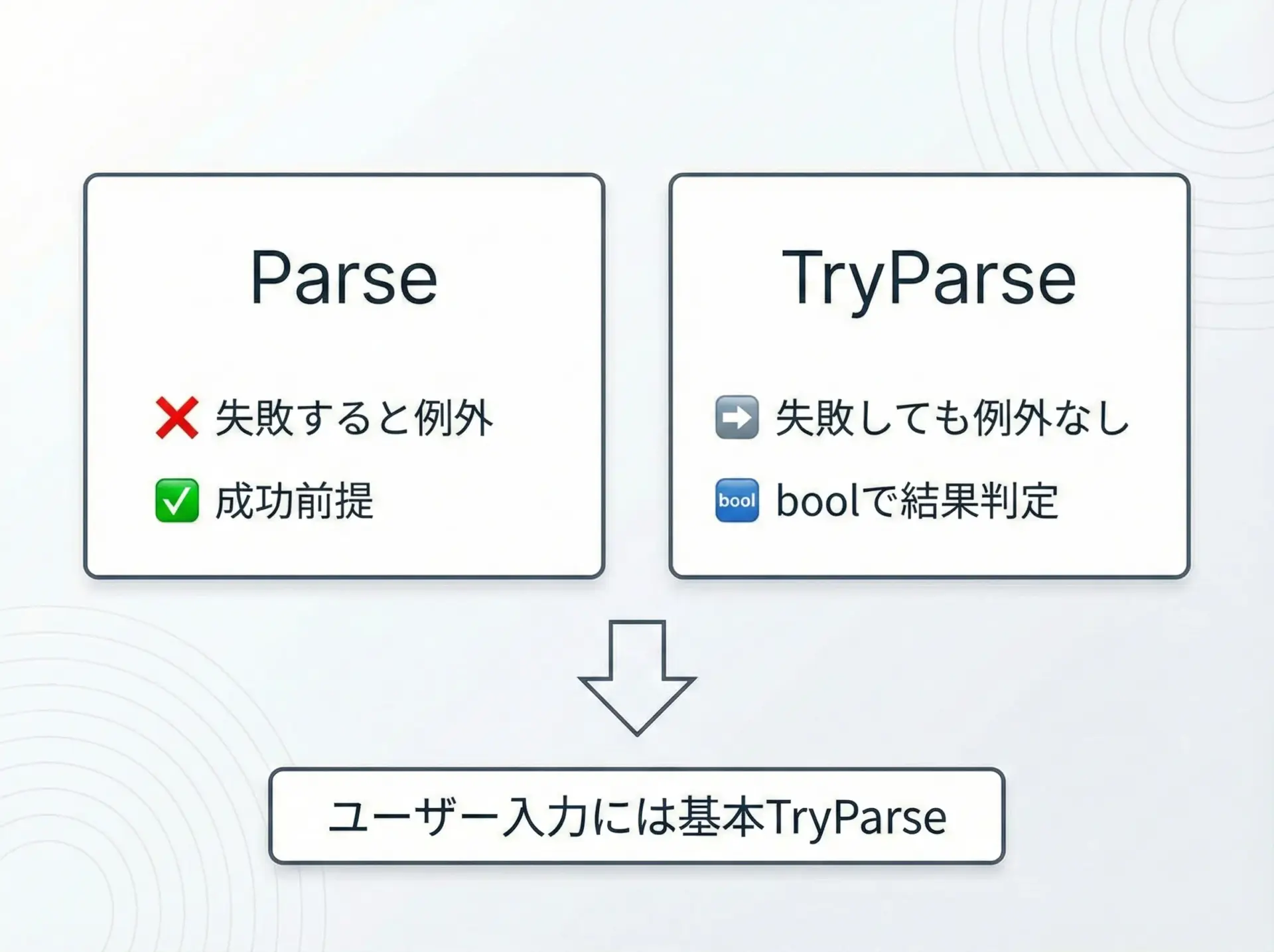 また、Parseは失敗時に例外を発生させるため、ユーザー入力にはTryParseを併用することが重要であることも紹介しました。