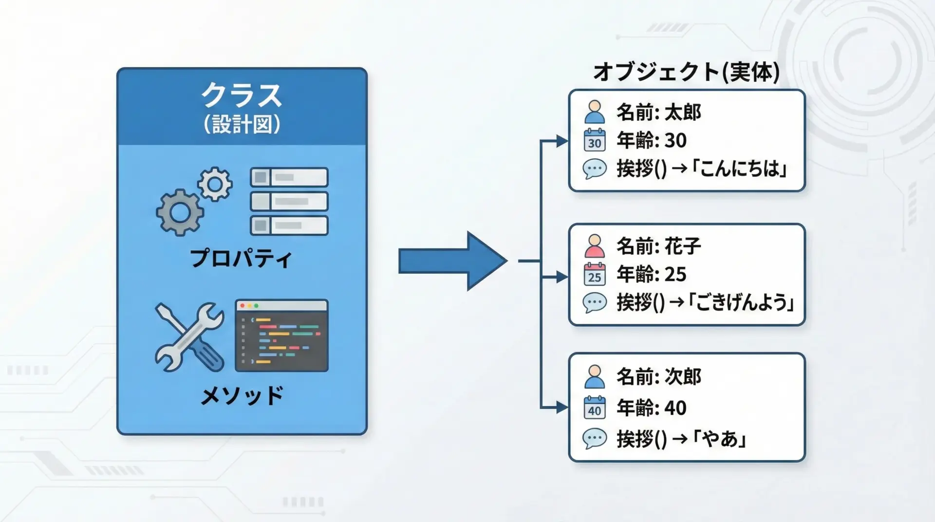クラスを理解する最初の一歩は、クラスは設計図、オブジェクトはその設計図から作られた実体というイメージを持つことです。