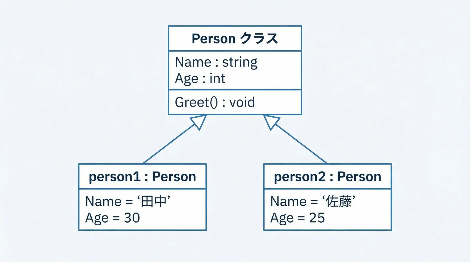 クラスは「型」、インスタンスは「その型の値」と考えると理解しやすくなります。