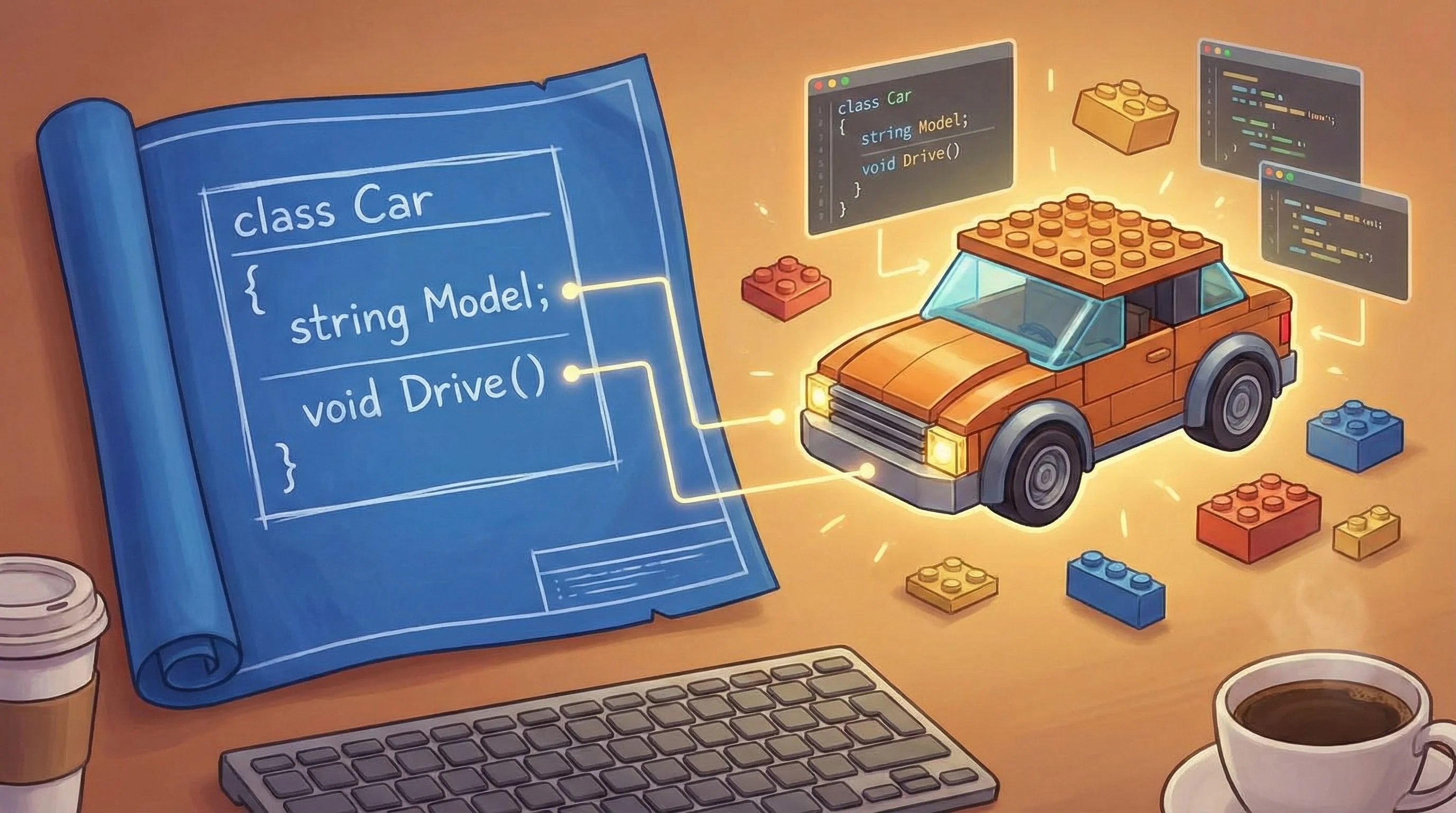 クラスを理解する最初の一歩は、クラスは設計図、オブジェクトはその設計図から作られた実体というイメージを持つことです。