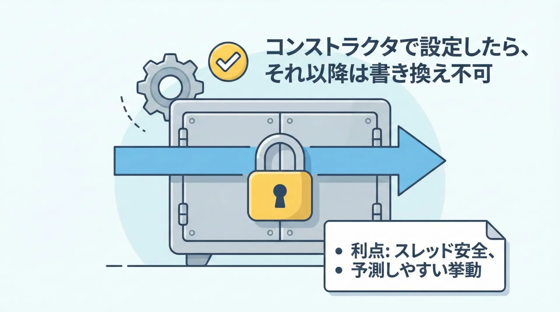 このようにコンストラクタ以外では状態を変えない設計をすることで、並行処理時のバグを減らし、コードの予測可能性を高めることができます。