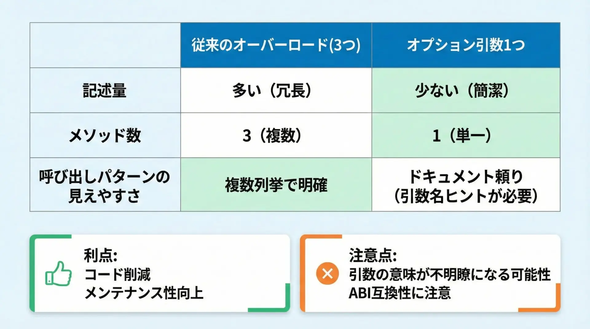 コンストラクタの数を増やさずに複数パターンの初期化を提供できる一方で、引数が増えると呼び出し側の可読性が落ちることもあるため、使いどころを意識することが大切です。