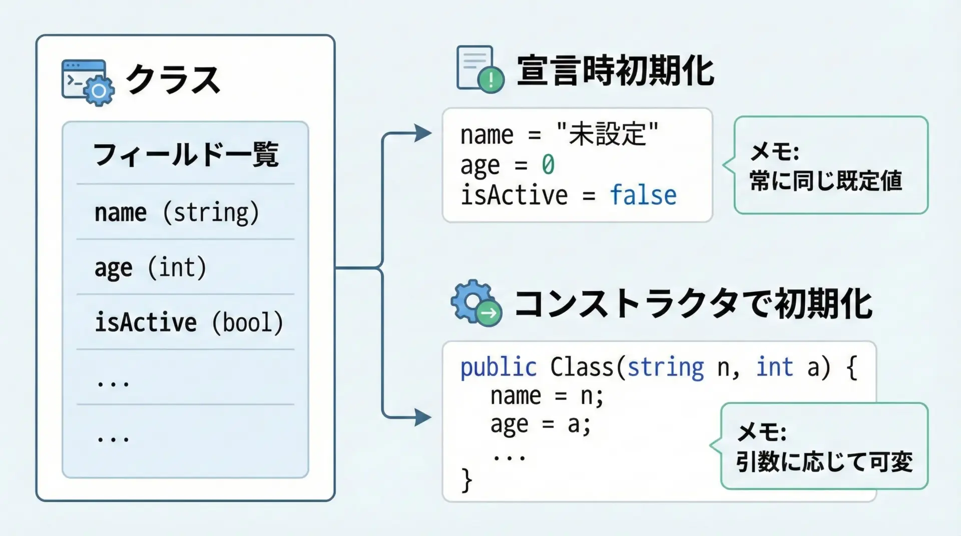 | フィールド宣言時初期化 | フィールドに直接初期値 | 常に同じ既定値にしたい時にシンプル | 設定がほとんど変わらない小さなクラス |
