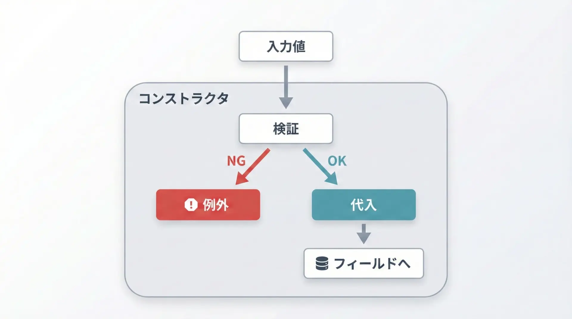 コンストラクタで不正なオブジェクトが生成されないようにしておくことで、後続の処理がシンプルになり、デバッグもしやすくなります。