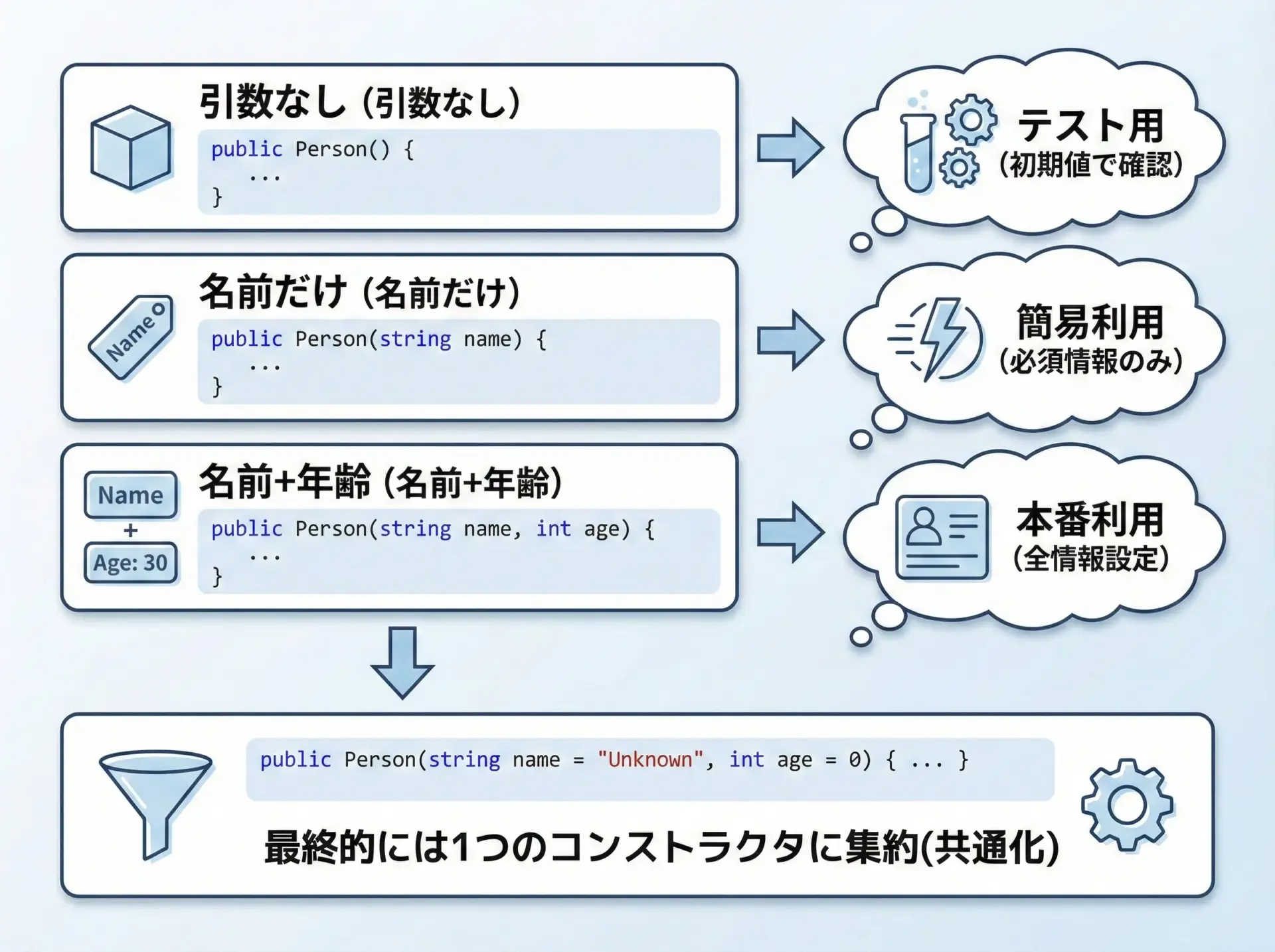 | 通常コンストラクタ | 引数を受け取り内部を初期化 | 必須情報を確実に設定できる | ビジネスロジックの中心となるクラス |