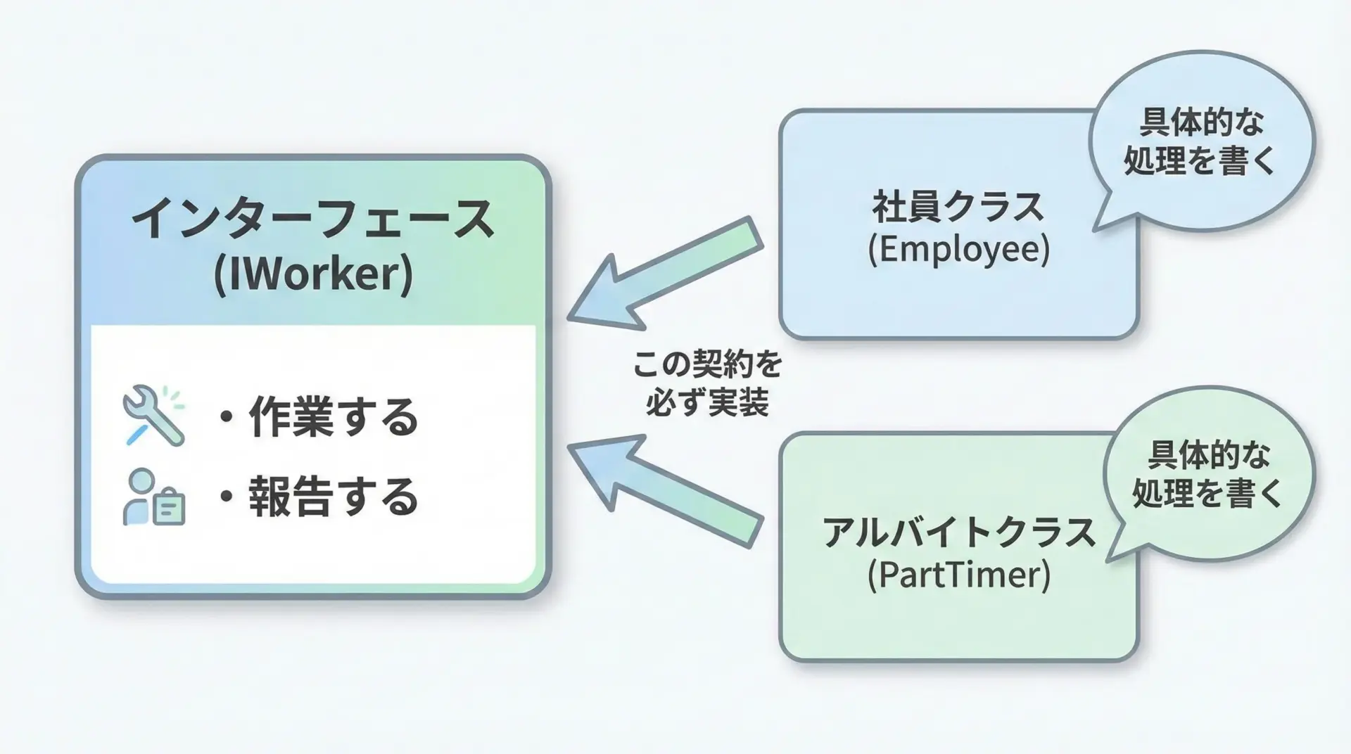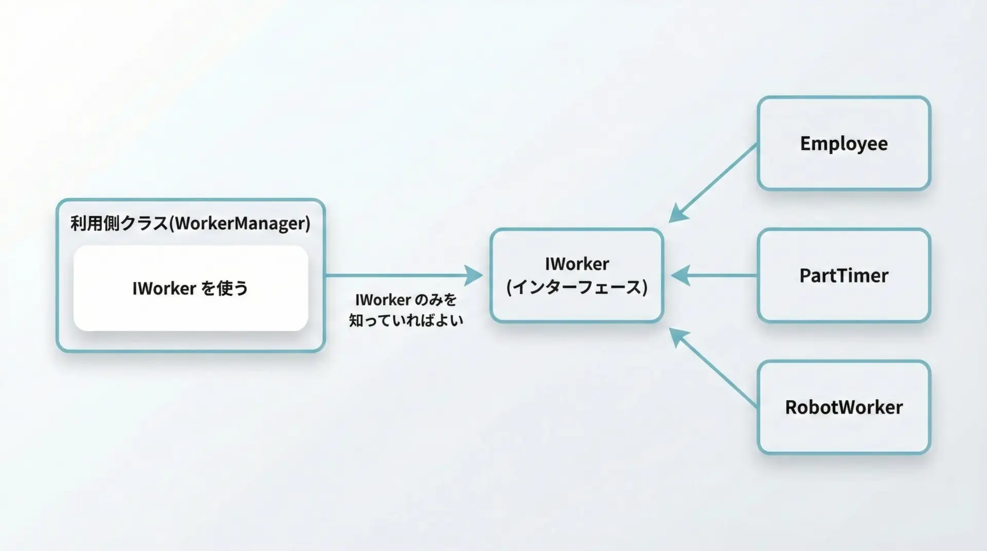 インターフェースを使うことで、「使う側」はインターフェースだけを知っていればよく、具体的なクラスの種類を意識せずに処理を呼び出せるようになります。