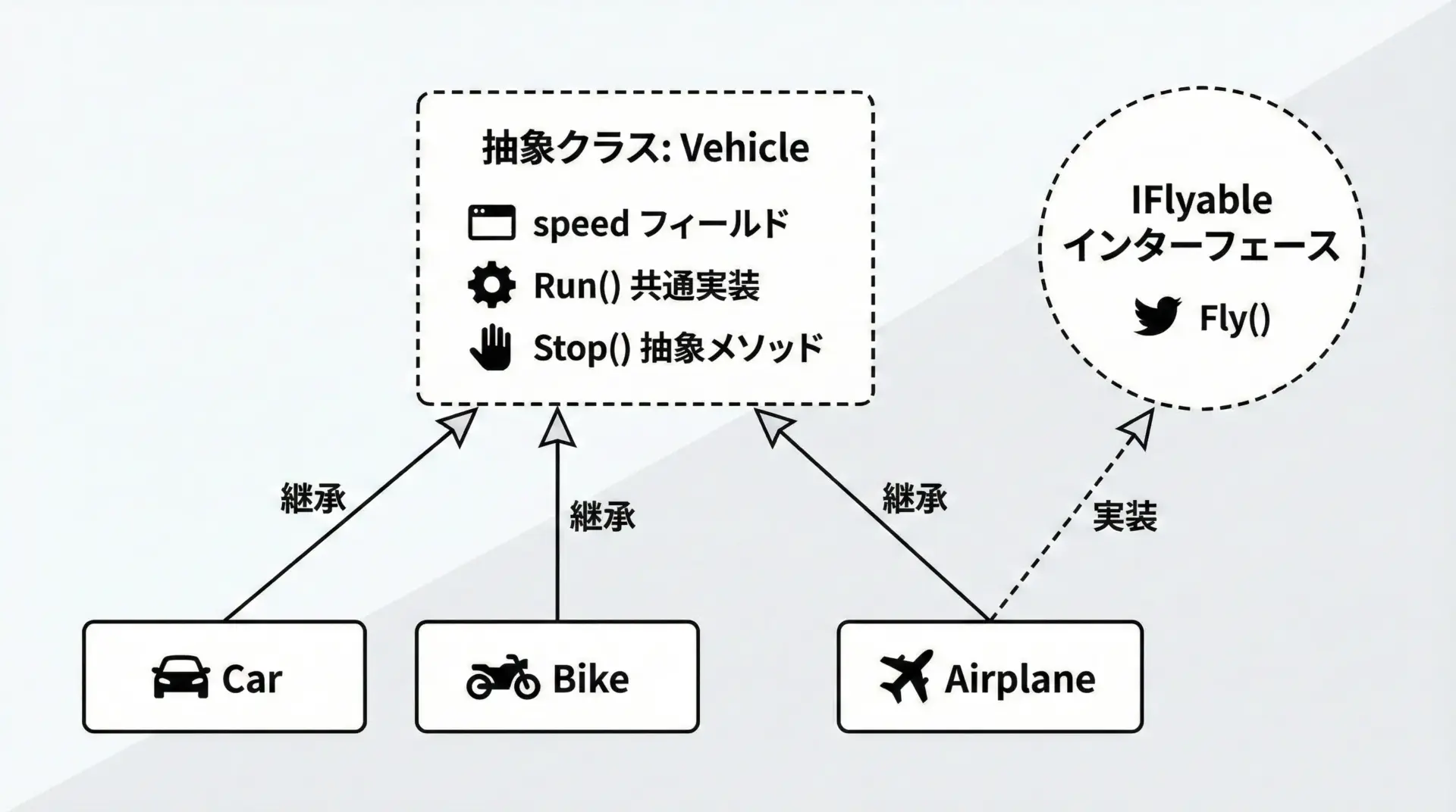 このように、継承階層を表現するのが抽象クラス、能力や機能のラベル付けに近いのがインターフェースというイメージで捉えると理解しやすくなります。