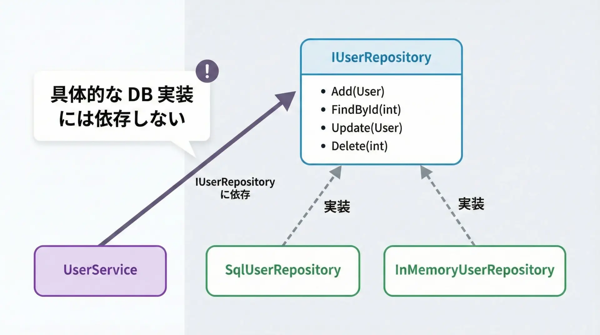 UserService は IUserRepository にのみ依存しており、具体的な実装(SqlUserRepository など)を知る必要がありません