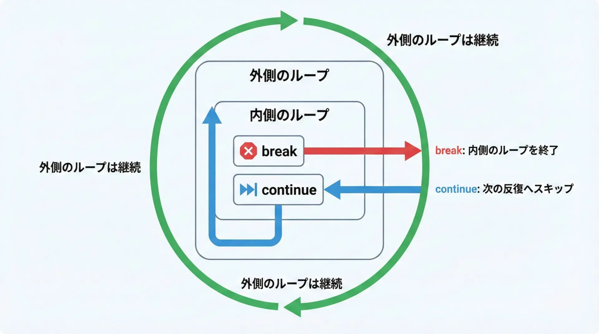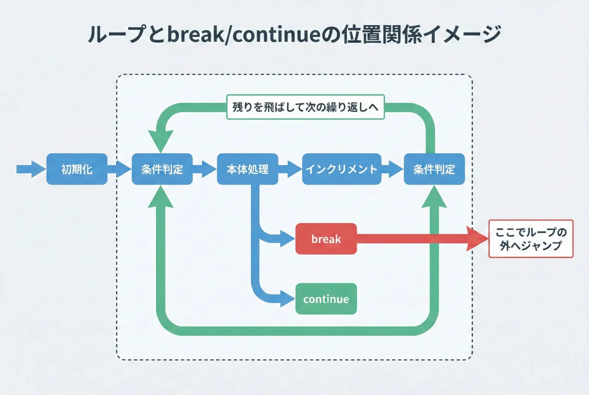検索処理の打ち切りにはbreak、不正データや不要ケースのスキップにはcontinueと考えると使い分けやすくなります。