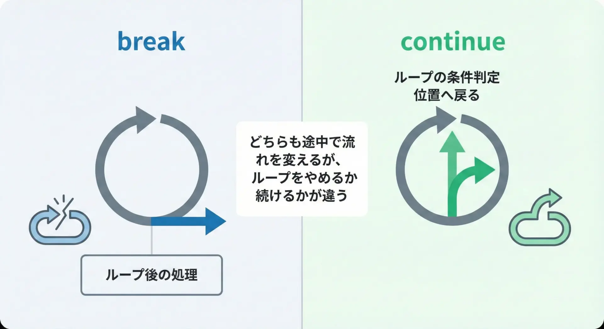 breakとcontinueを迷わず使い分けるコツは、次の1行に集約できます。