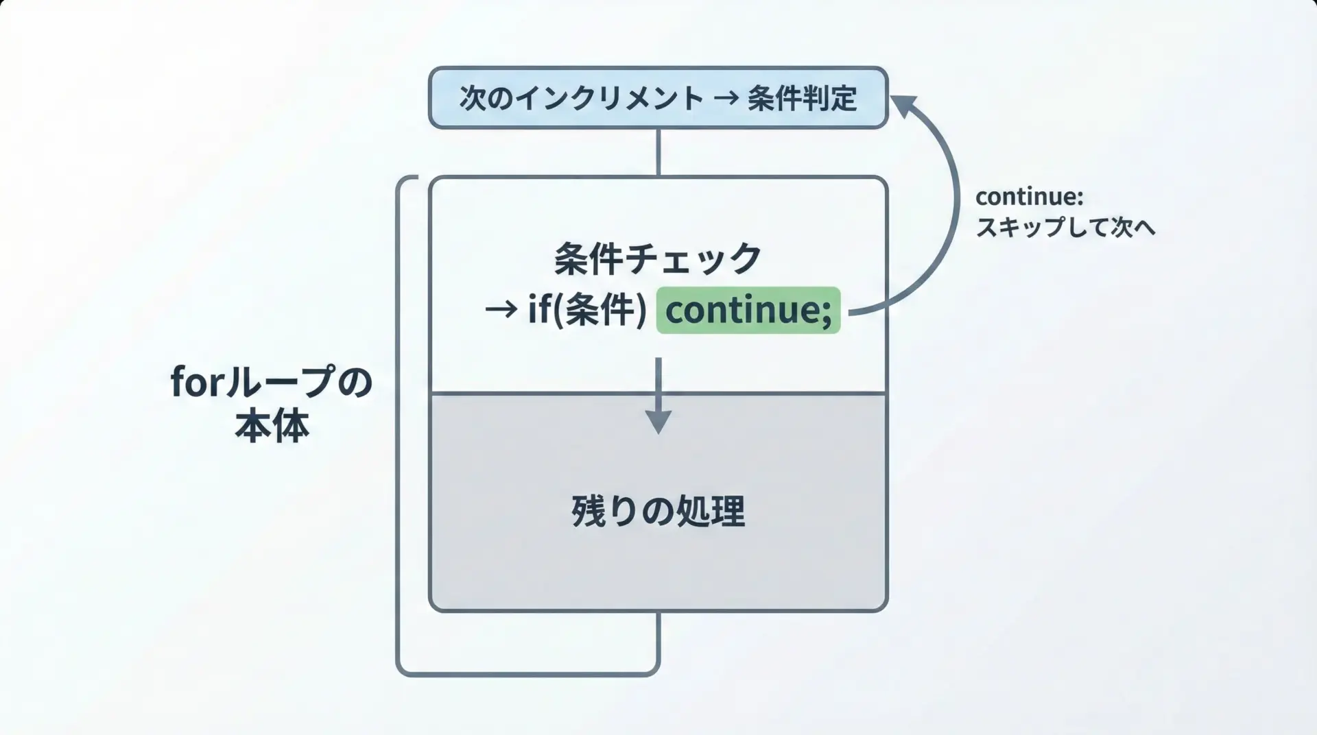 「一部だけ無視したい」場面ではcontinueが自然です。