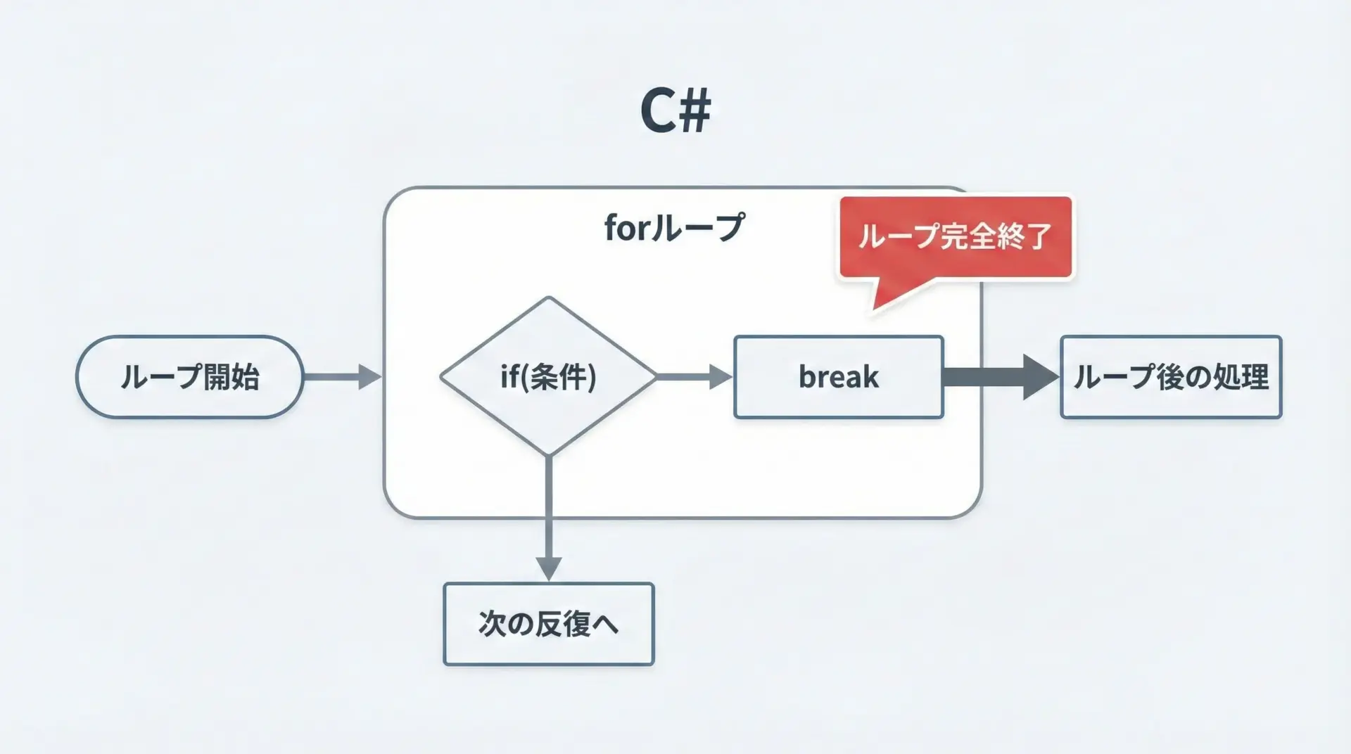 どちらも便利ですが、乱用するとかえって読みにくくなるため、ループの目的を整理しながら「終わらせたいのか」「一部だけ飛ばしたいのか」を意識して選択すると、意図どおりかつ読みやすいC#コードを書けるようになります。