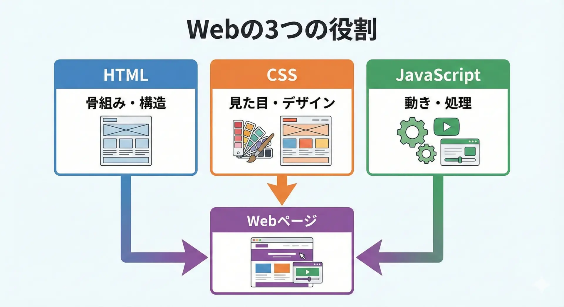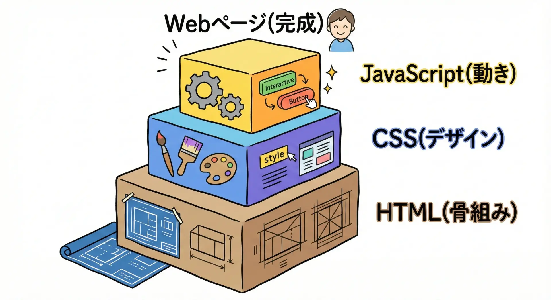 画面の骨組みはHTMLが、見た目のデザインはCSSが、そして動きや処理はJavaScriptが担当します。