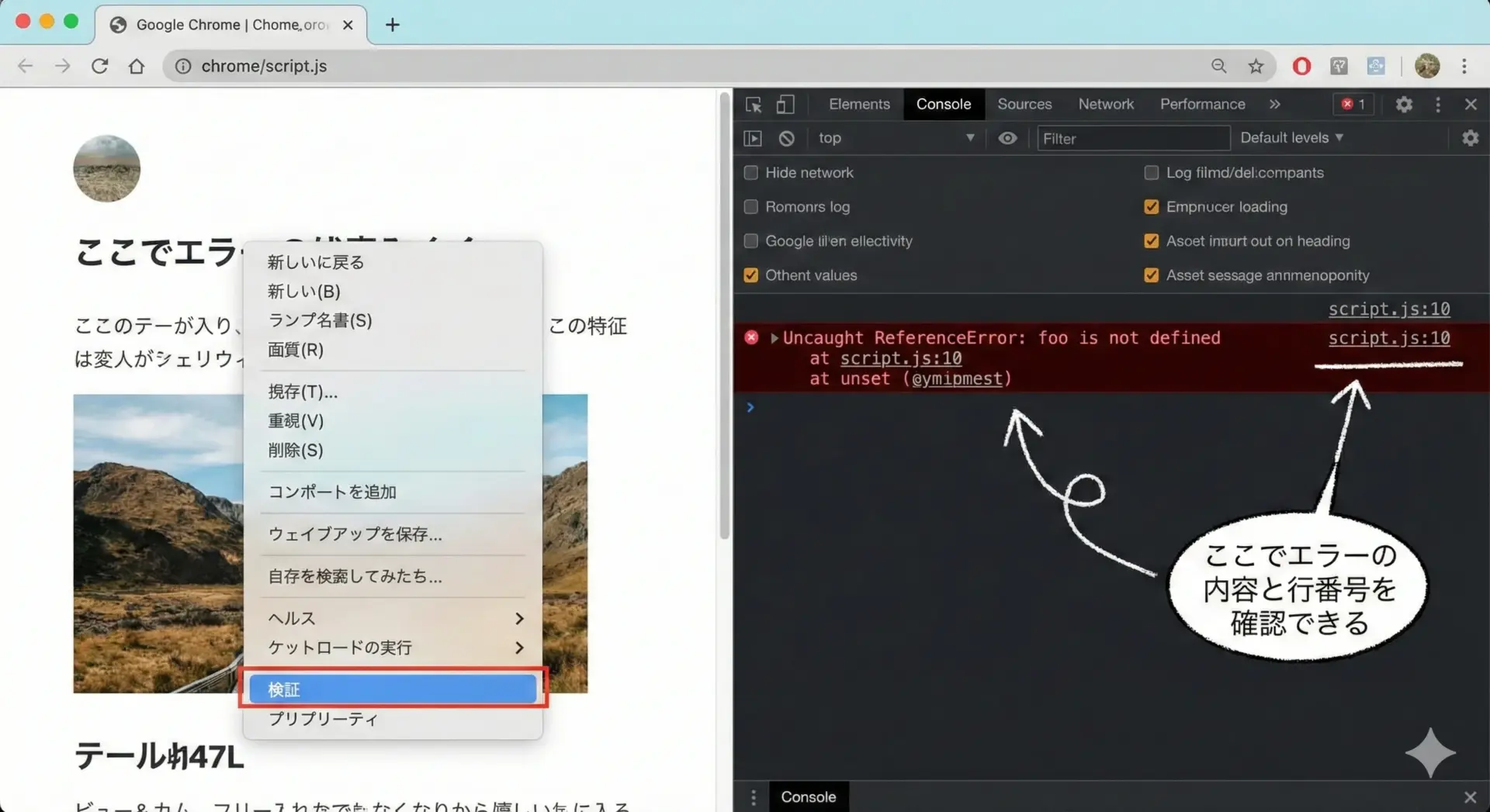 Chromeの場合は、画面を右クリックして「検証」を選び、「Console」タブを開くとエラー内容が表示されます。