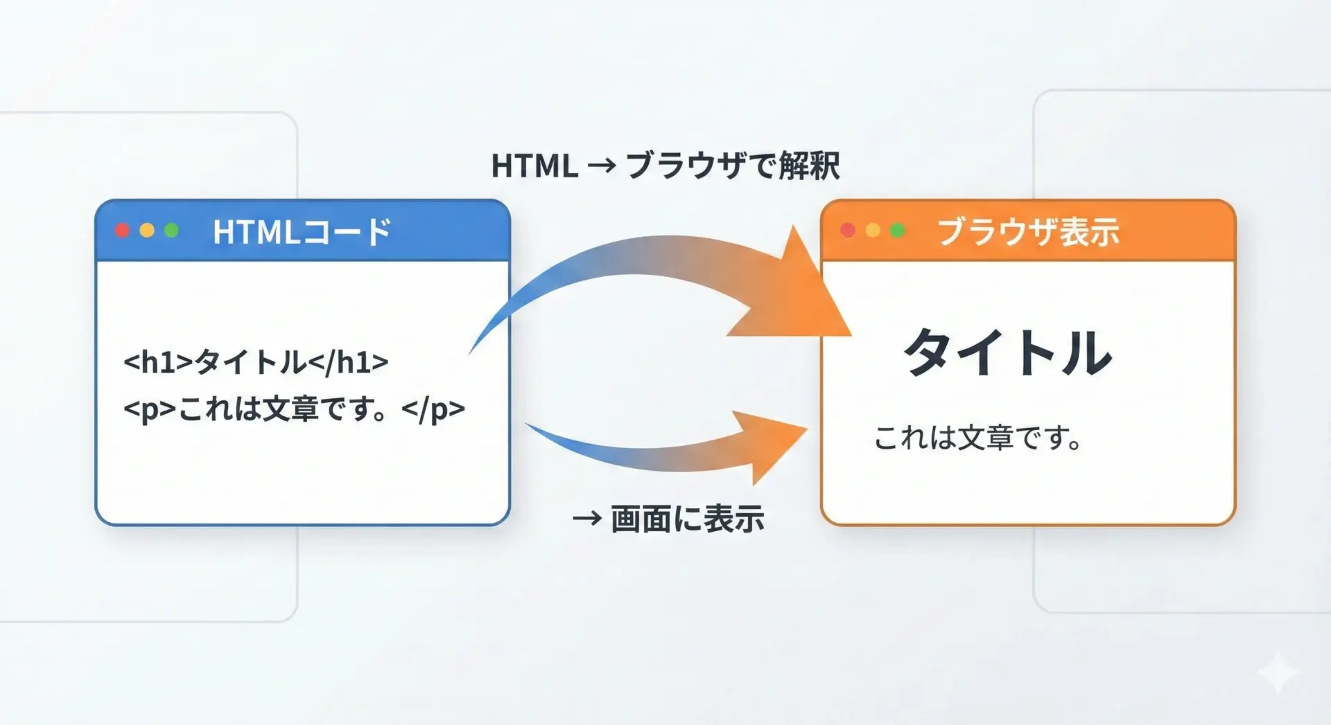 HTMLは、見出し・段落・リンク・画像・リスト・フォームなど、「どこに何があるか」を定義する役割を持ちます。