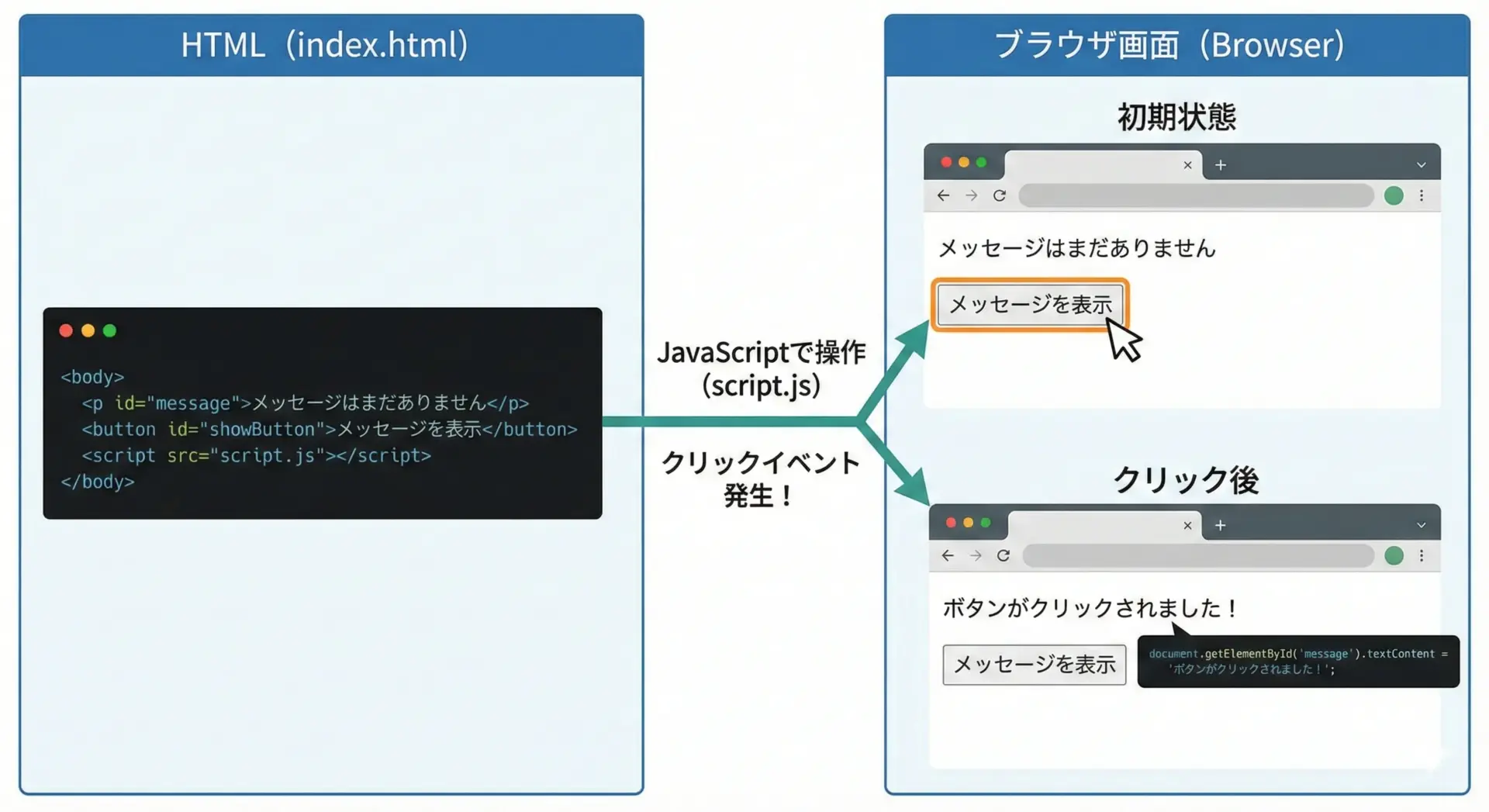 document.getElementById("myButton")で、HTMLのid="myButton"のボタンを取得button.addEventListener("click", ...)で、「クリックされたとき」の処理を登録- その中で