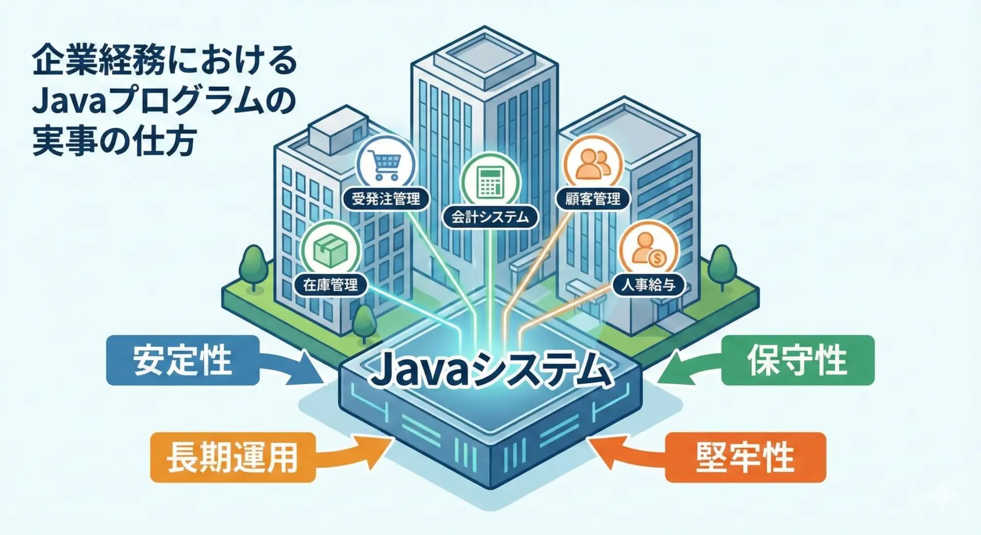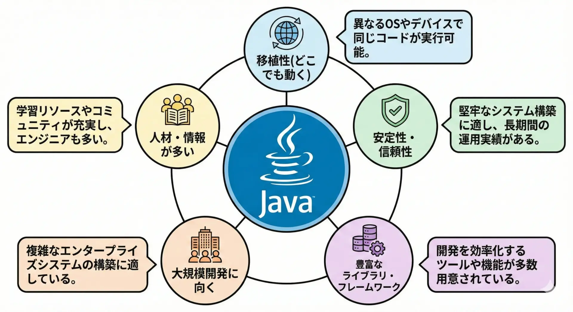 Javaは、型安全性・例外処理・トランザクション管理などの仕組みを備えており、これらの要求を満たすための基盤として適しています。