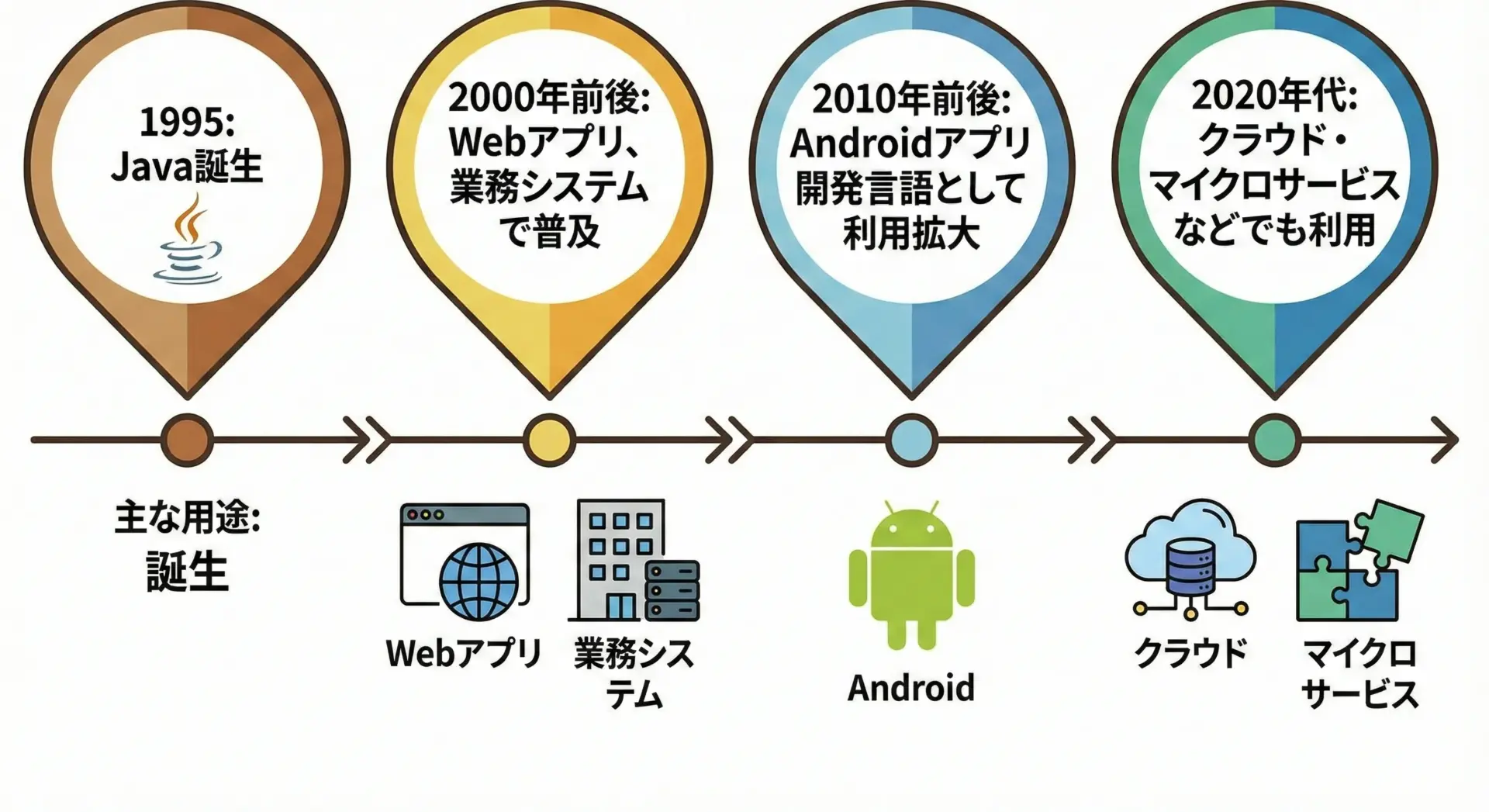 当初は家電機器向けなども想定されていましたが、その後サーバサイド開発や企業向け業務システムで急速に普及しました。