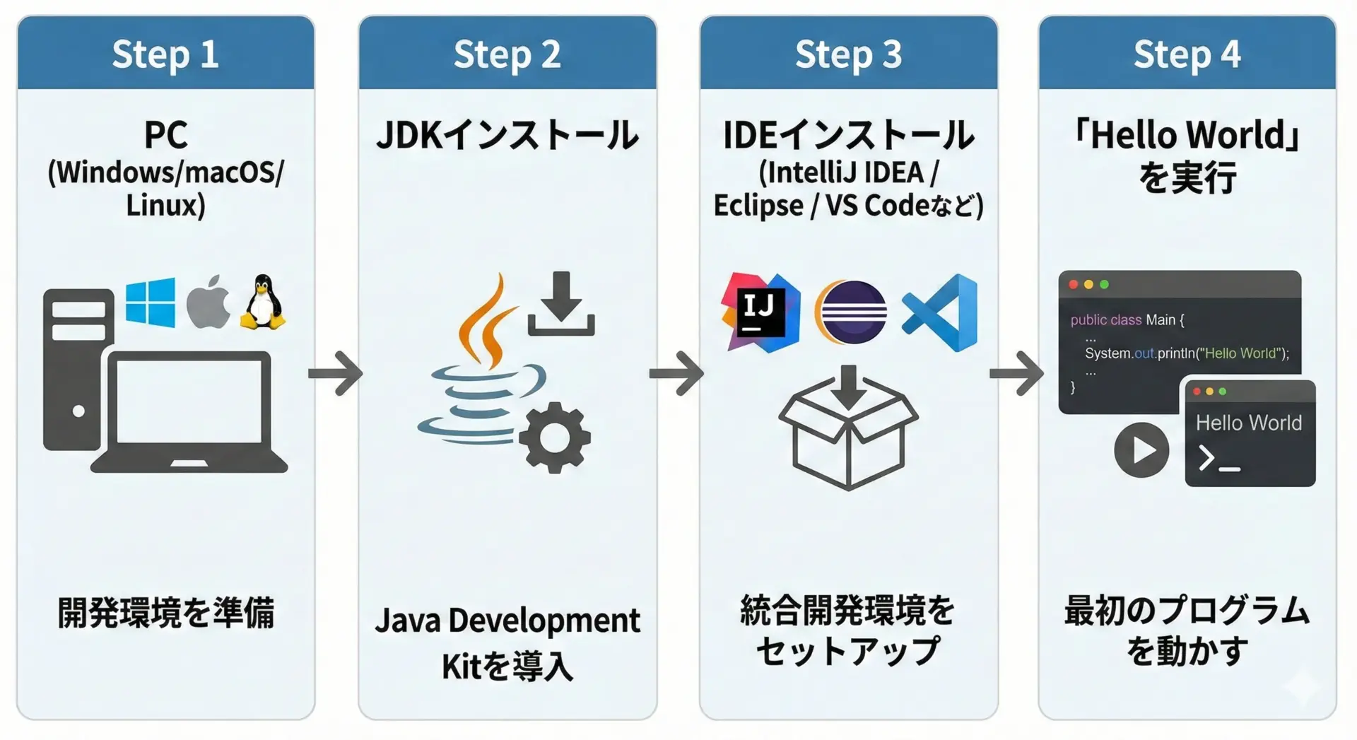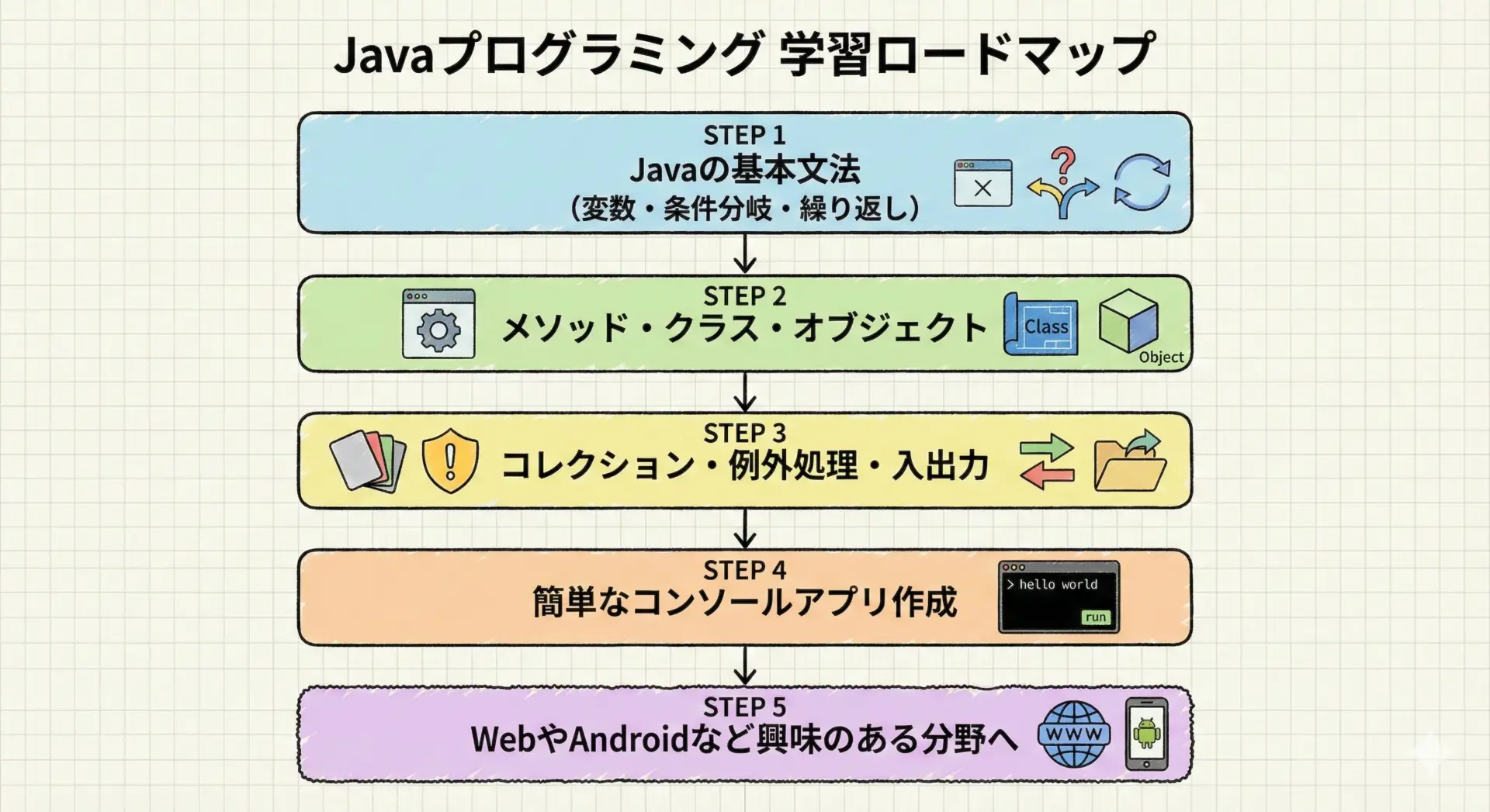 初心者がJavaを学ぶ際の典型的なステップを、順を追って説明します。
