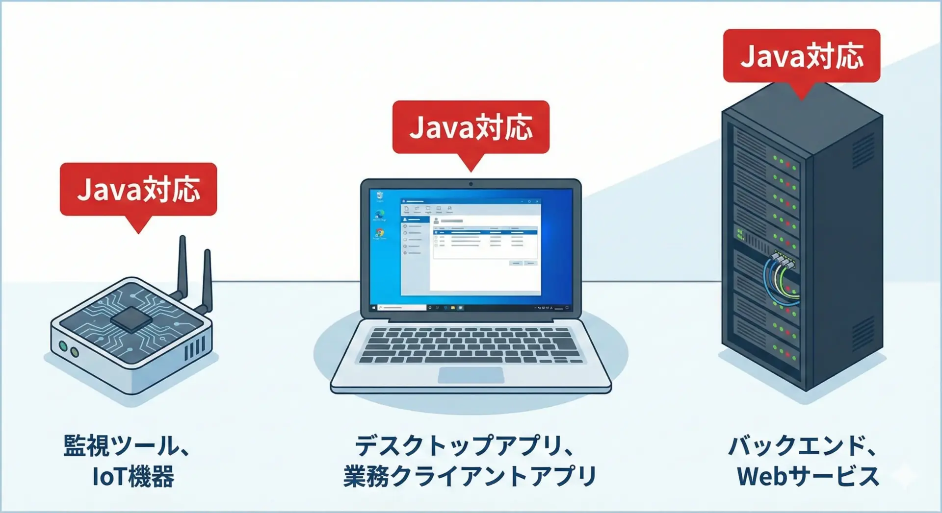 このように、Javaはサーバサイド中心とはいえ、「PC上のツール」から「IoTデバイス」まで幅広い層をカバーできる汎用言語です。