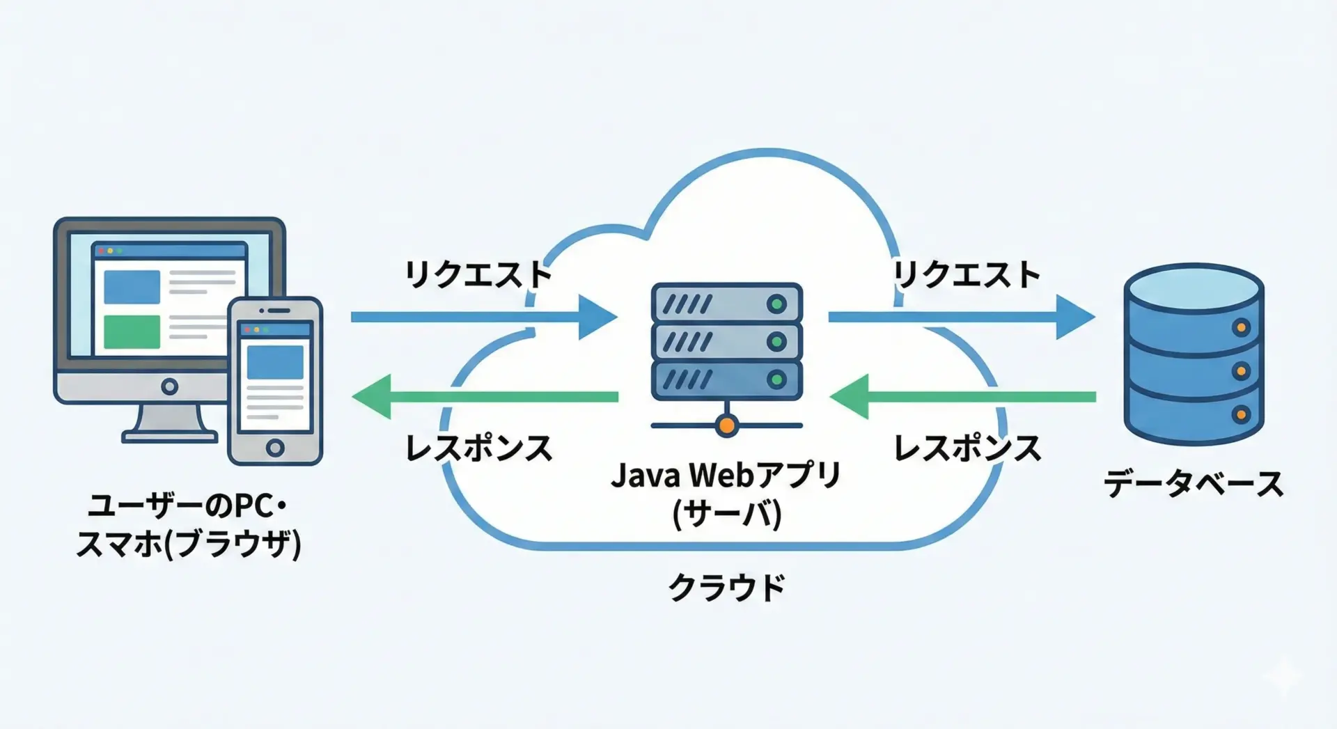 具体的には、ブラウザからのHTTPリクエストをJavaで受け取り、必要な処理を行ってHTMLやJSONをレスポンスとして返すという流れになります。