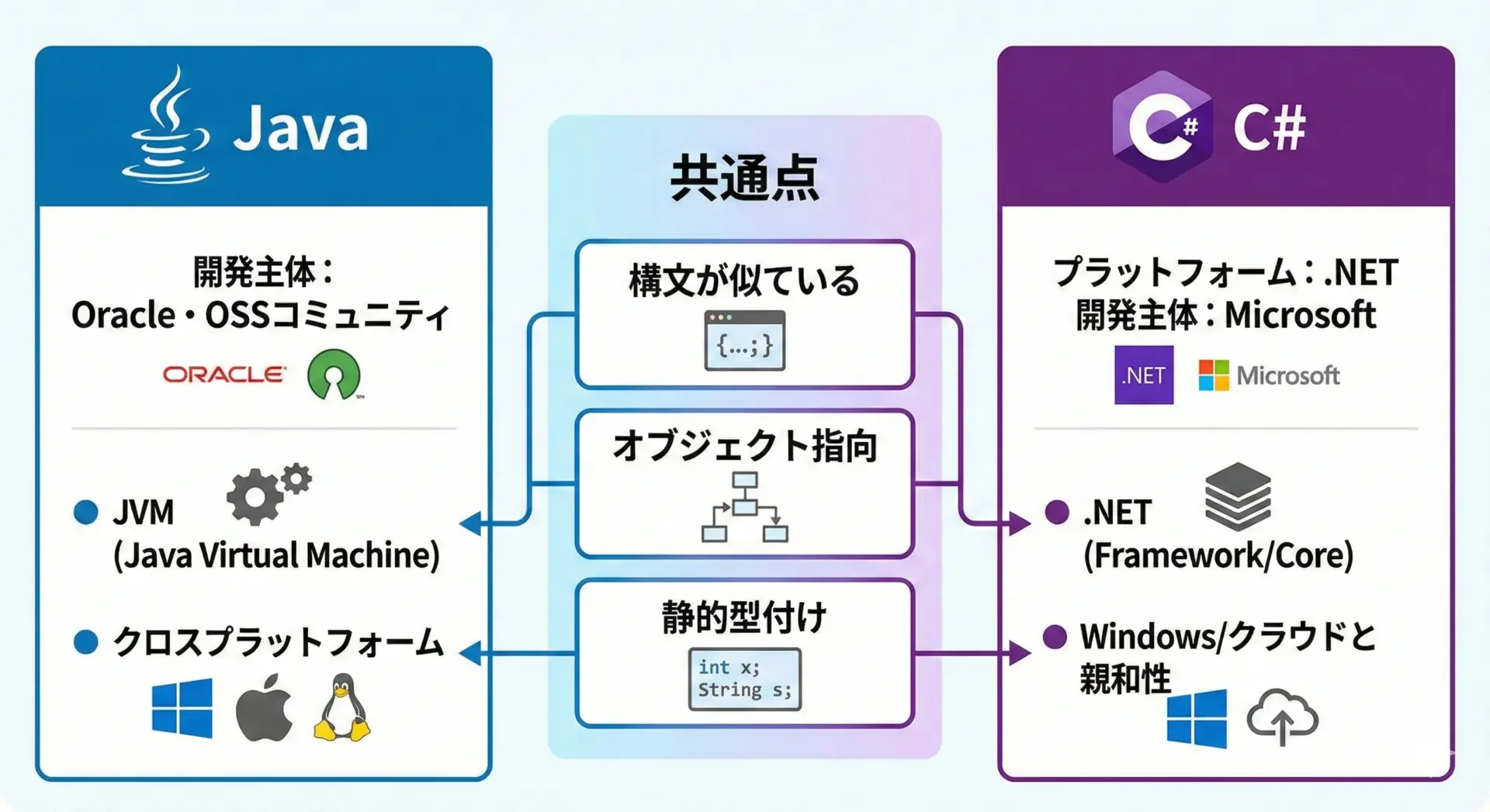 JavaとC#は、文法や考え方が非常によく似た言語です。