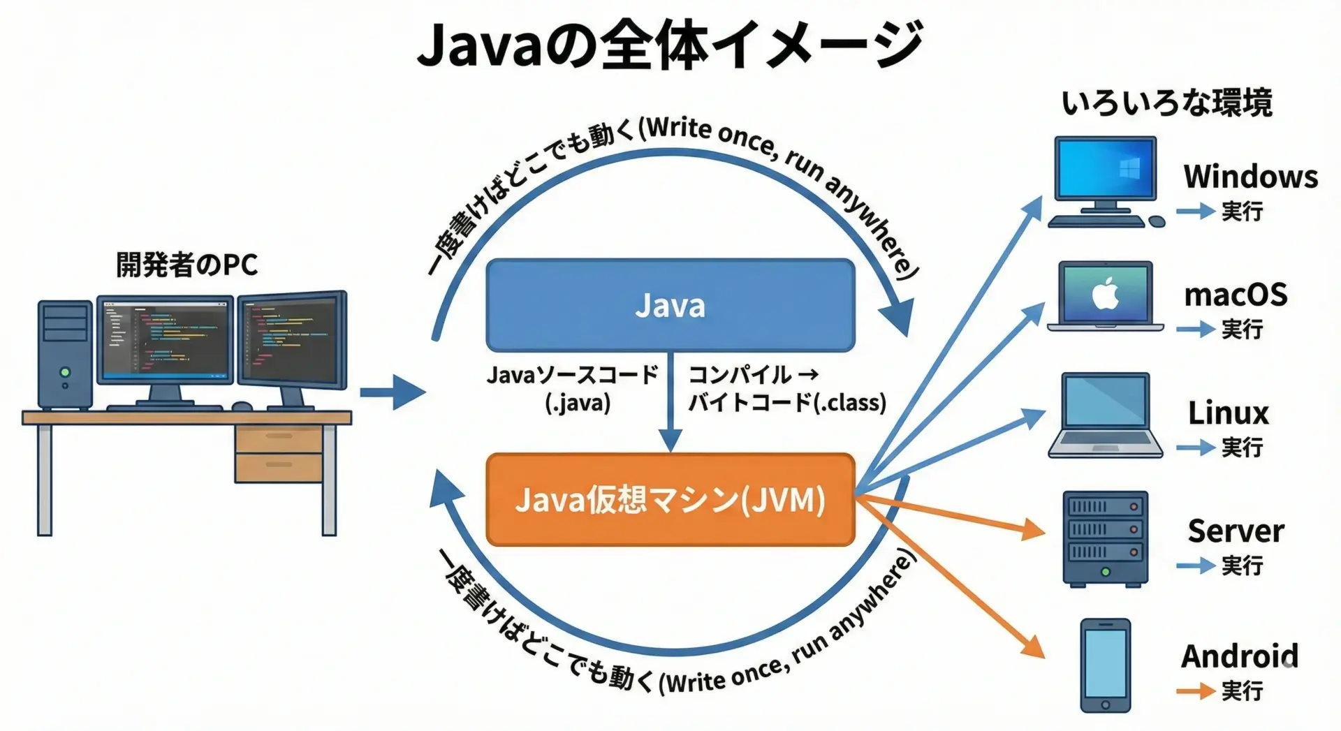 「Write once, run anywhere(一度書けばどこでも動く)」という思想のもと設計され、Windows・macOS・LinuxといったOSの違いを意識せずに同じJavaプログラムを動かせる点が大きな特徴です。