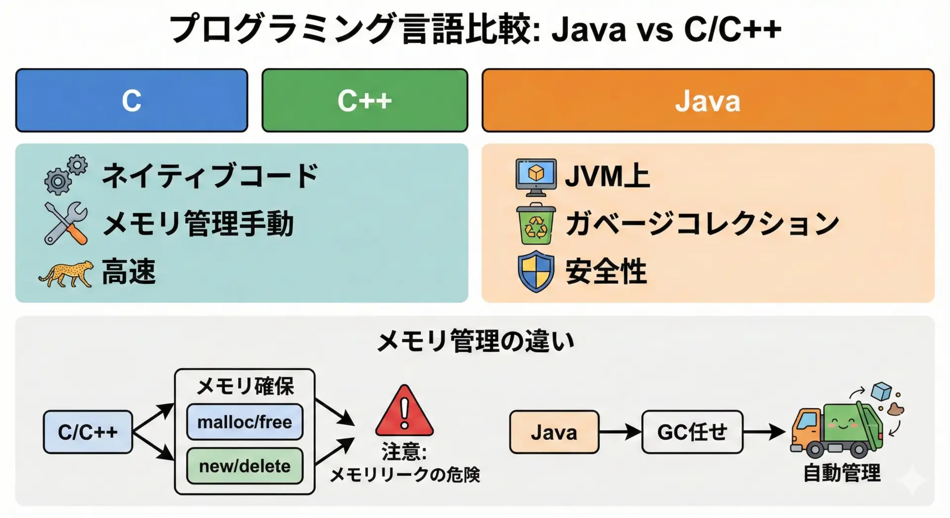 そのため、安全性と開発効率を重視したい場面ではJava、ハードに近い制御や最高速が必要な場面ではC/C++という使い分けが一般的です。