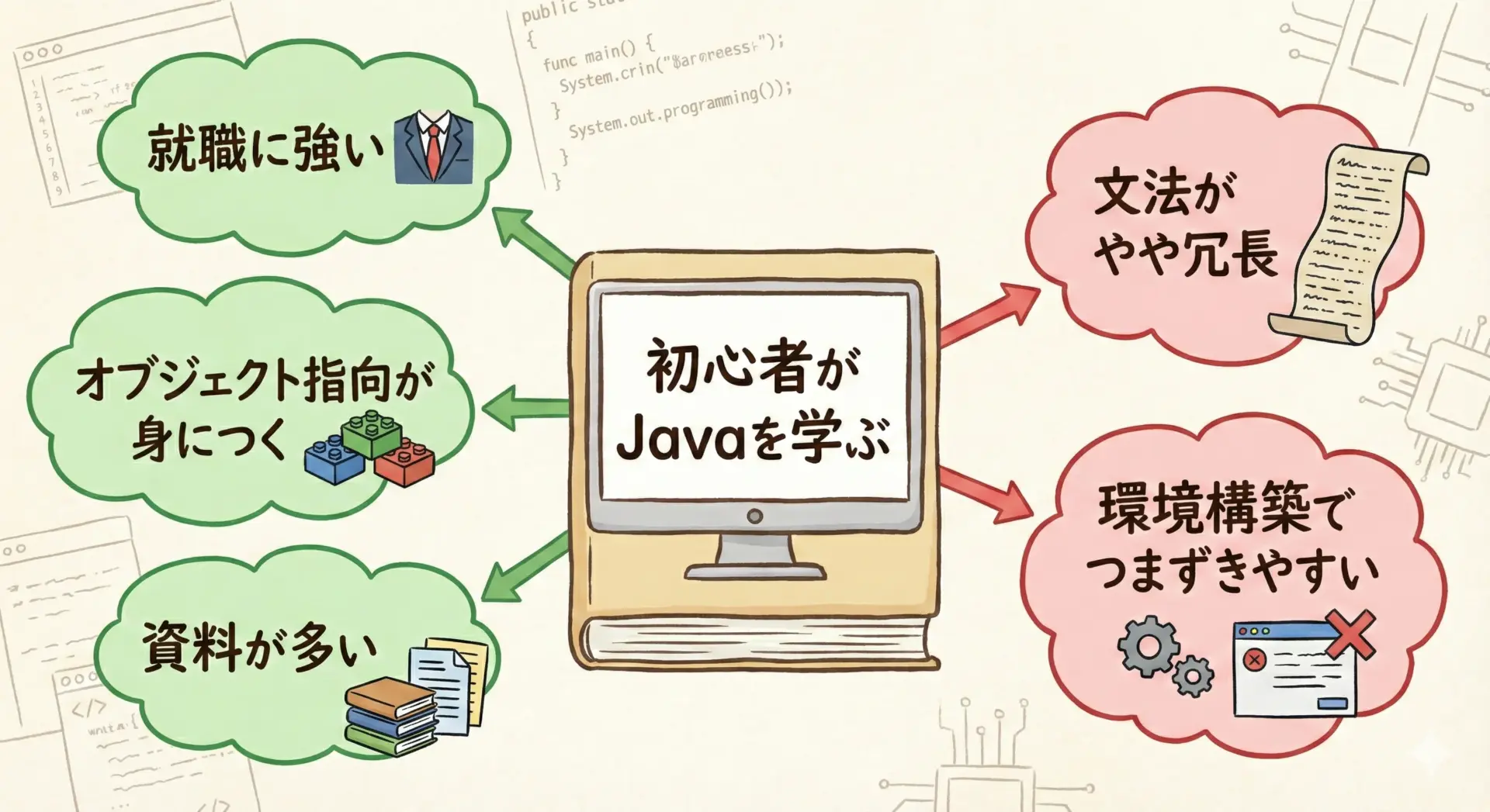 初心者にとってJavaは「少し難しそう」と感じられるかもしれませんが、学習言語としてのメリットも大きいです。