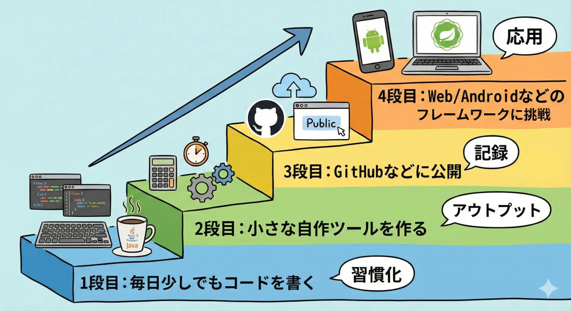 Java学習を続けるうえで大切なのは、「少しずつでも継続すること」と「小さくても自分の作品を作ること」です。