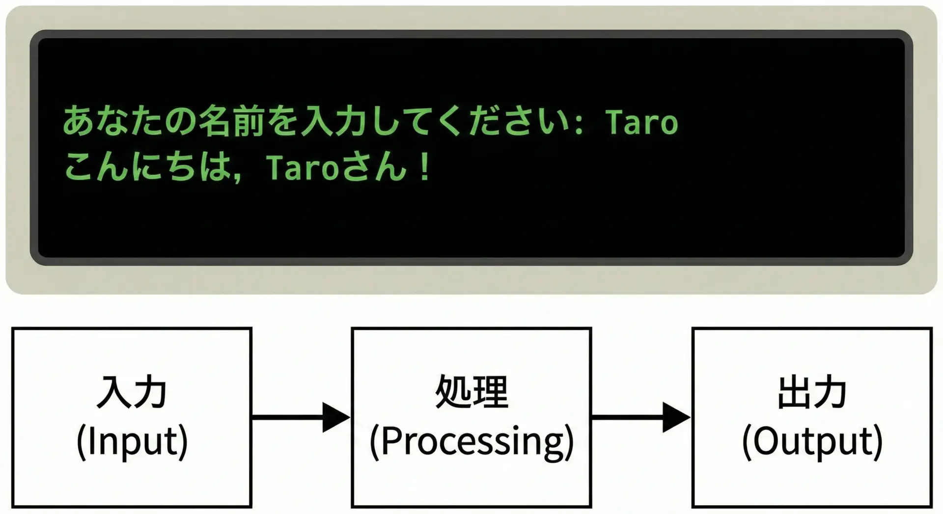 このプログラムでは、入力(Scanner) → 処理(文字列の結合) → 出力(System.out.println)という、プログラミングの基本的な流れを体験できます。
