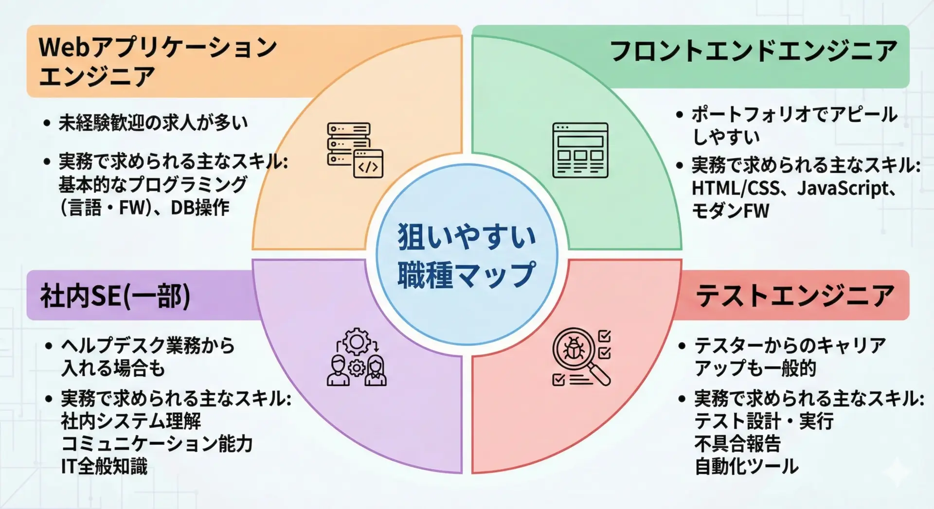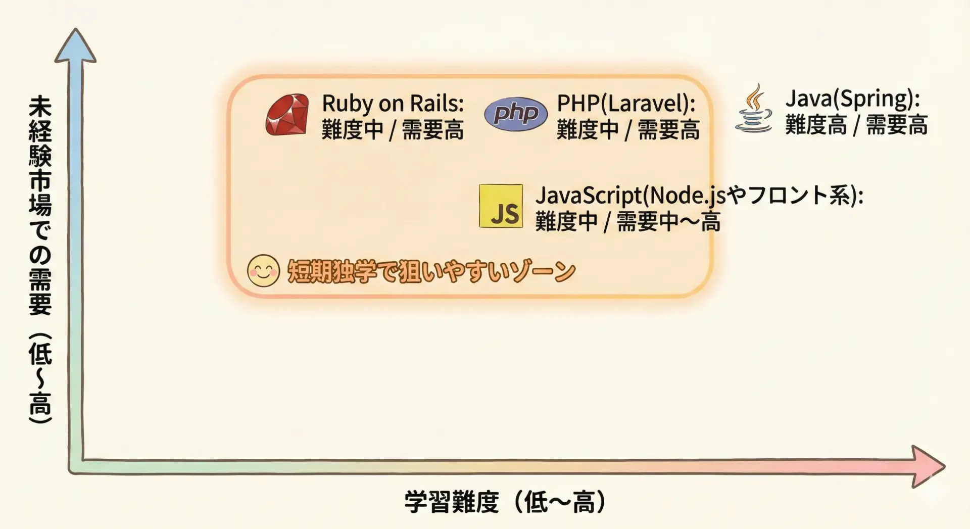短期の独学から転職を目指す場合、「学習しやすく、かつ未経験採用の求人が一定数ある技術スタック」を選ぶことが重要です。