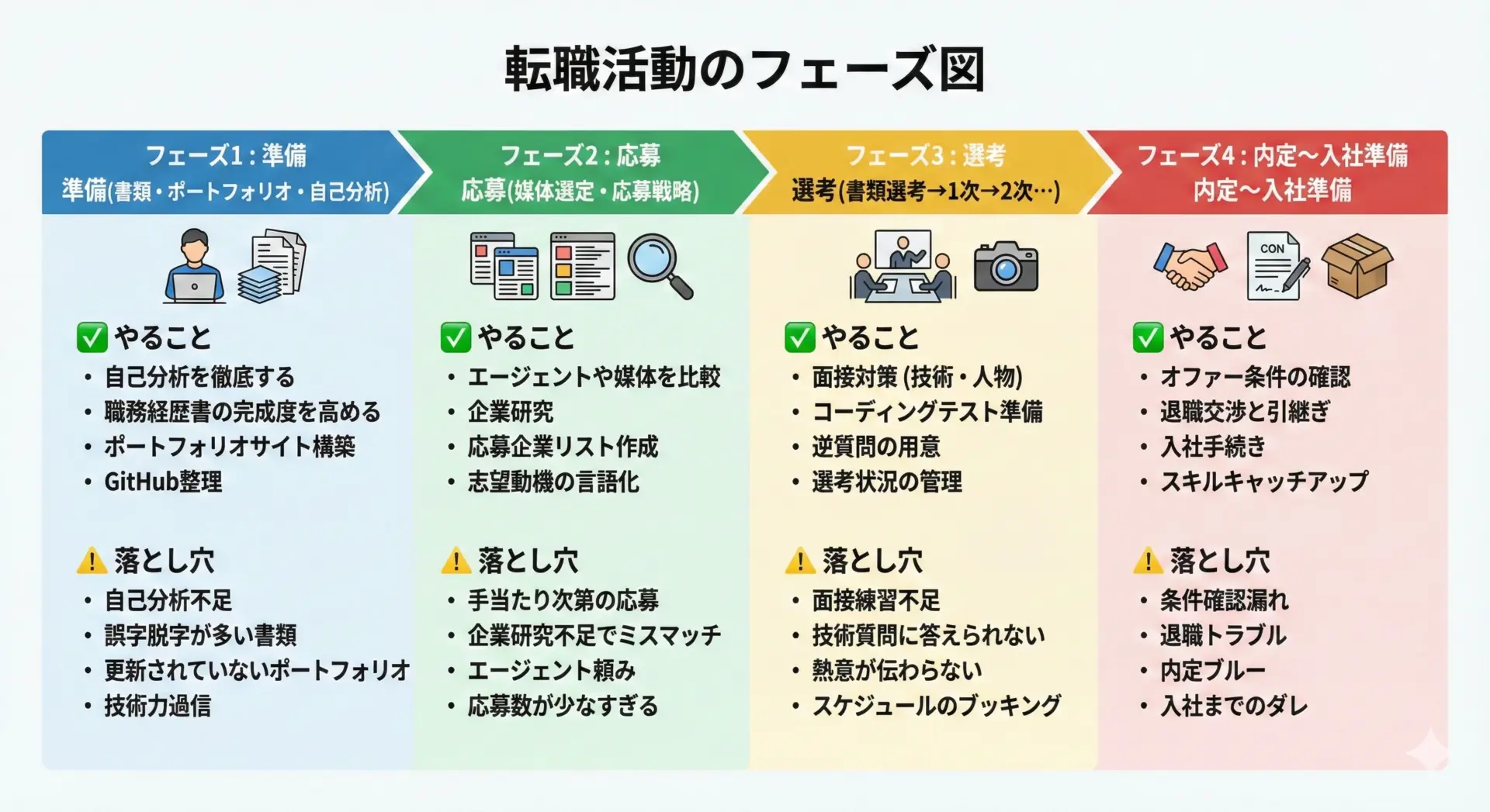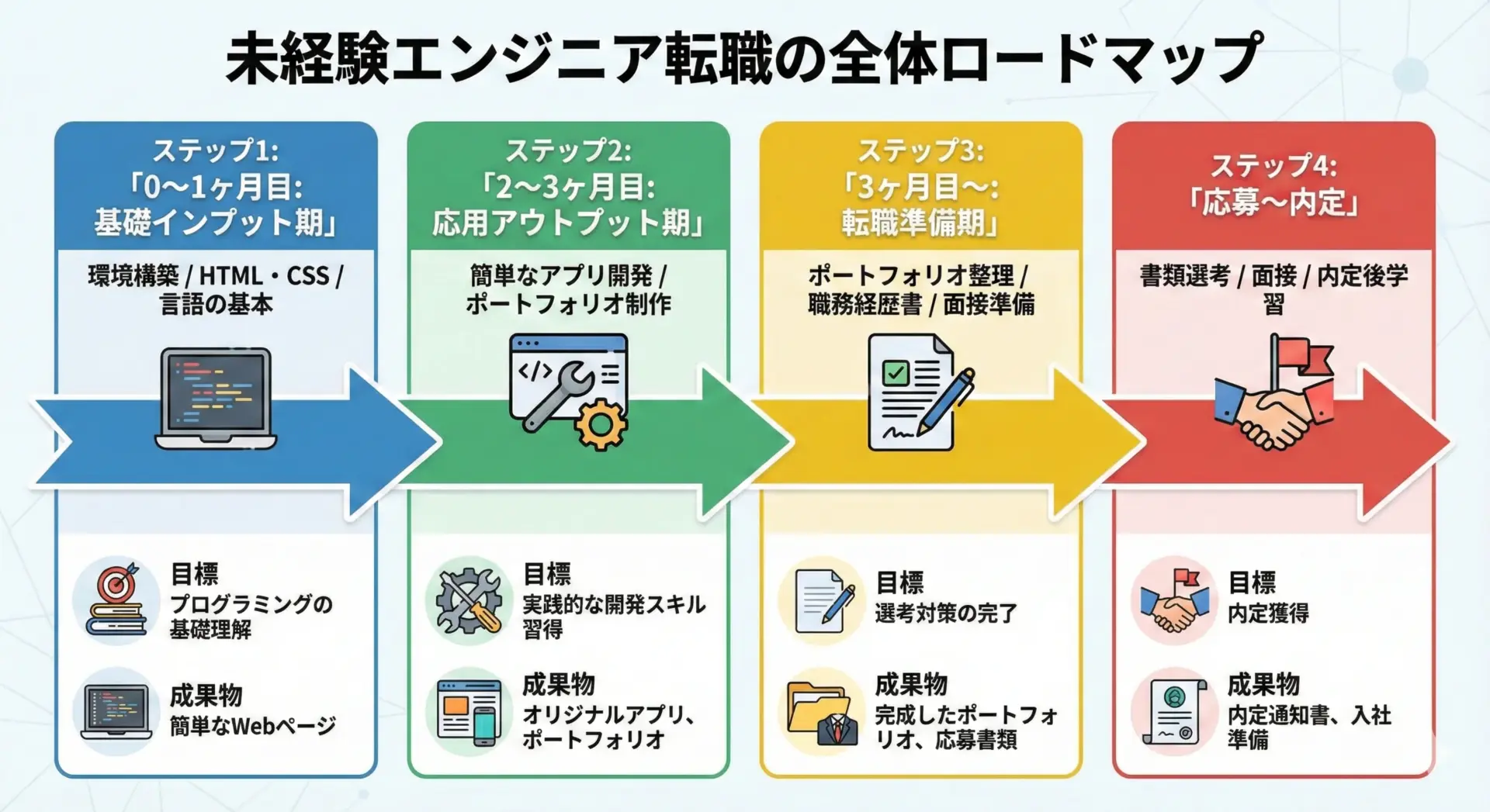 この章では、まず未経験からエンジニア転職を目指すときの全体像をつかみます。