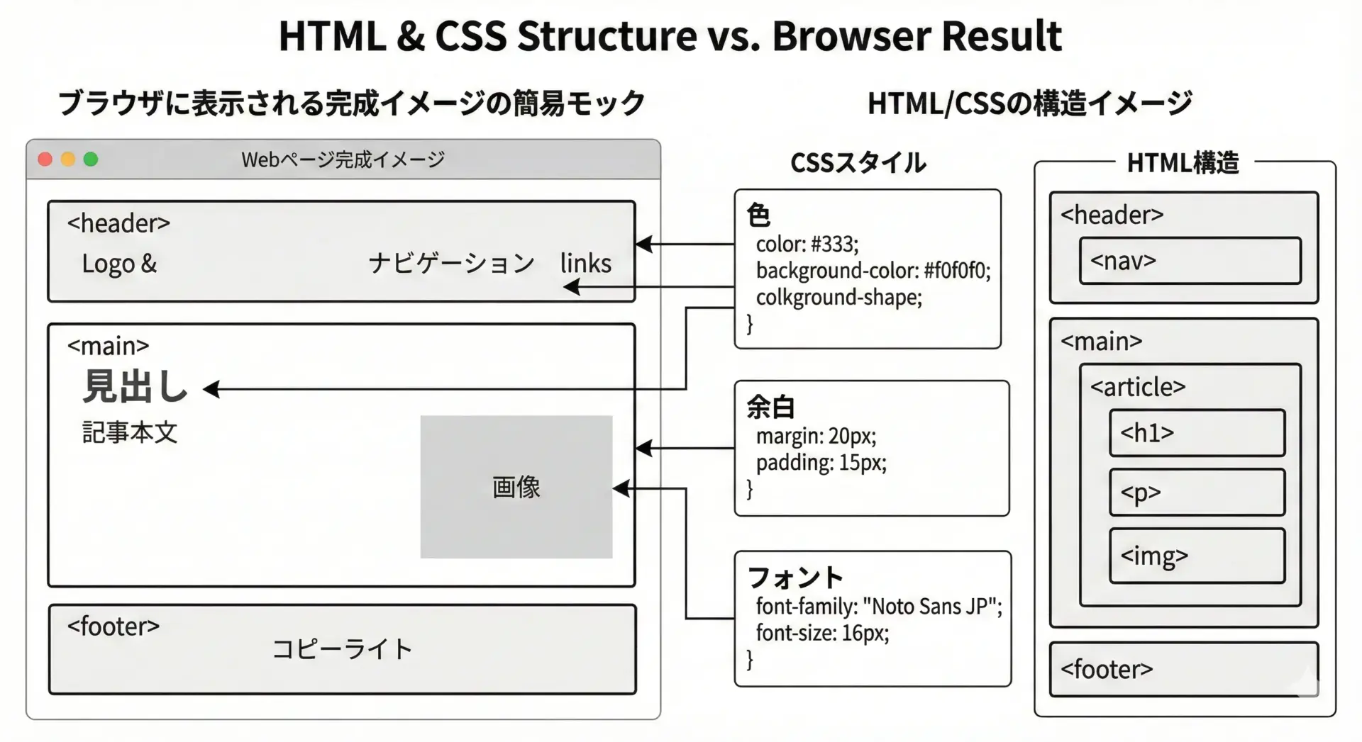 一方CSSは、文字サイズや色、余白、配置などの「見た目」を指定する役割を持ちます。