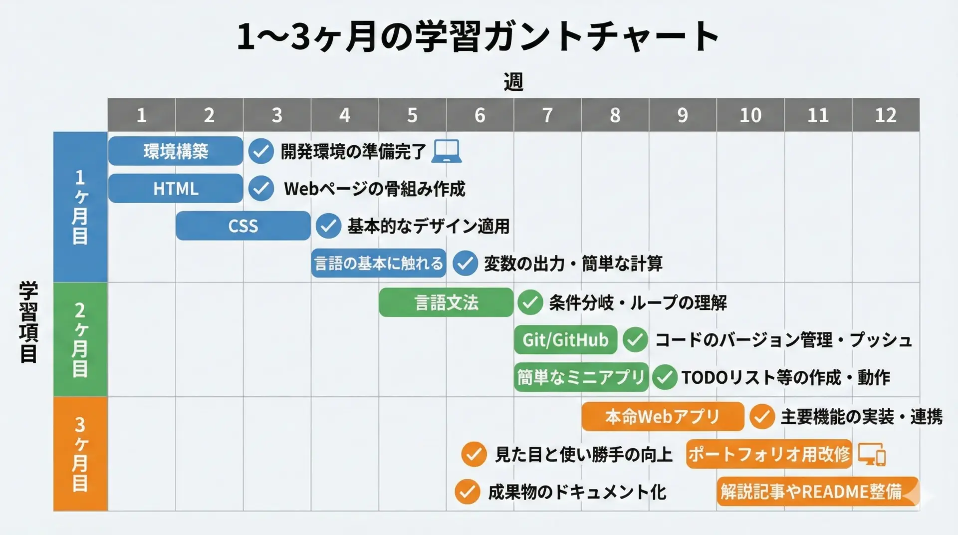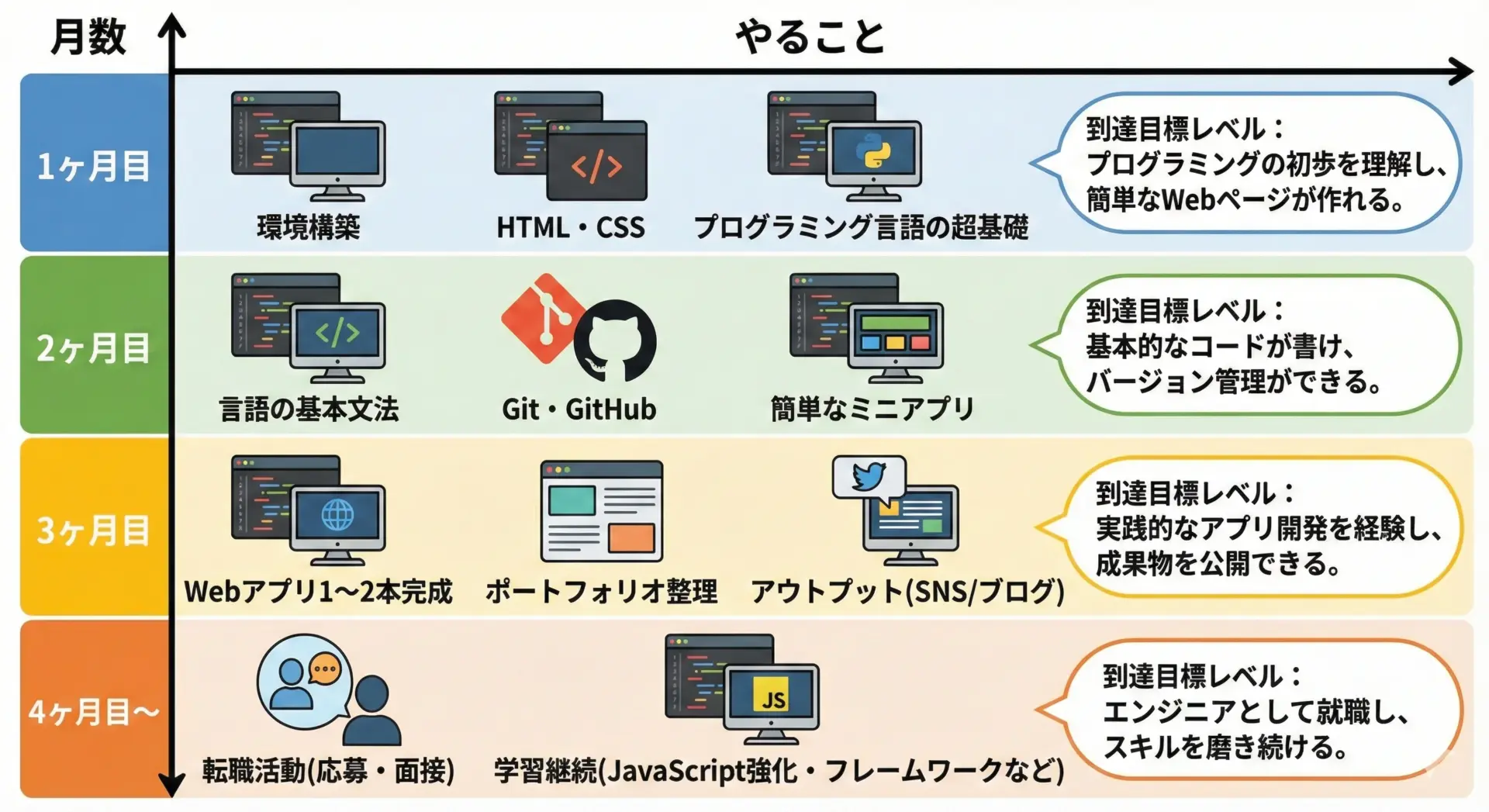単なる学習内容の列挙ではなく、「いつ」「何を」「どのレベルまで」やれば転職活動で戦えるのかを、時系列で具体的に落とし込みます。