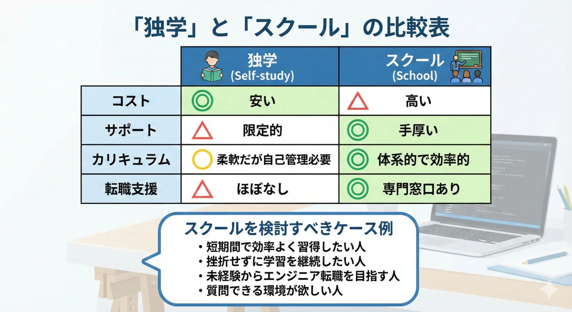 一方で、独学である程度進められている場合は、ピンポイントのメンタリングサービスやコミュニティ参加など、よりコストを抑えた選択肢も検討できます。